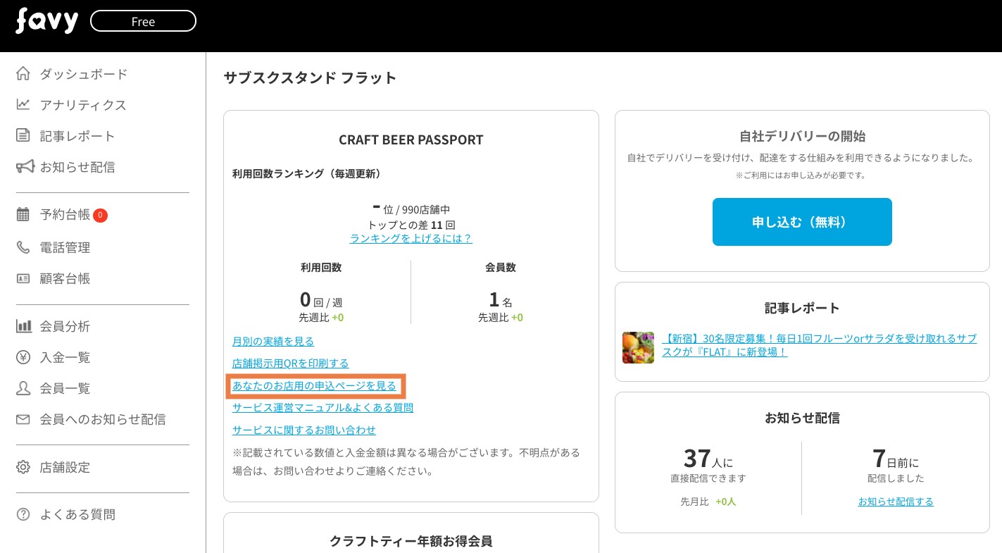ダッシュボードのエリアサブスクの欄から「あなたのお店用の申し込みページを見る」をクリックする
