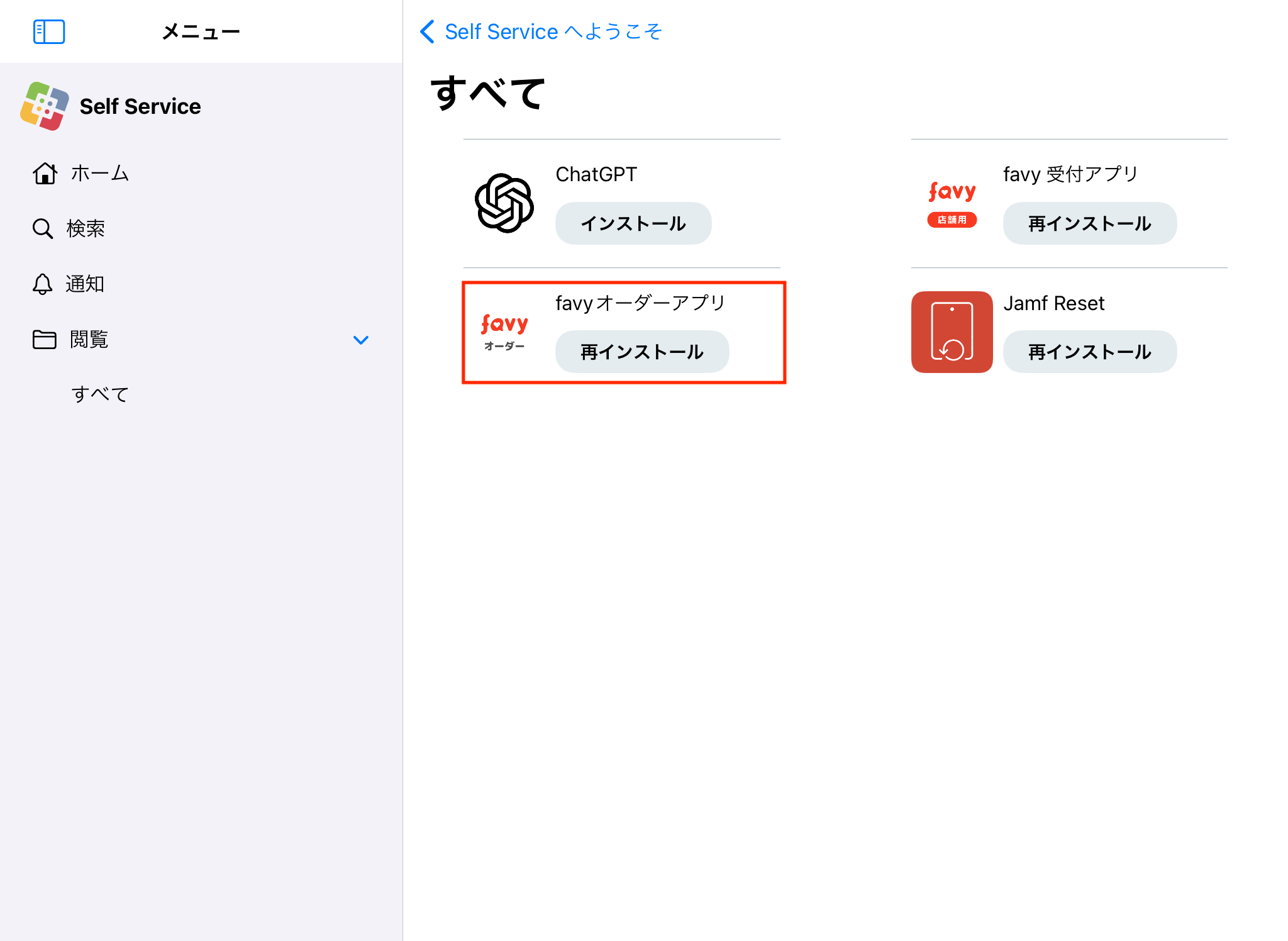 「favyオーダーアプリ」の「再インストール」を選択してください。最新版のアプリがインストールされます。