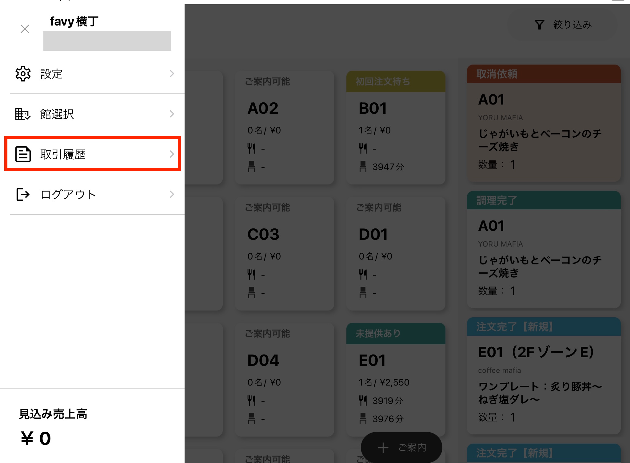 オーダーアプリ(館ログイン)のナビゲーションメニューに「取引履歴」の項目が追加され、過去7日間分の取引履歴を確認することができるようになりました。