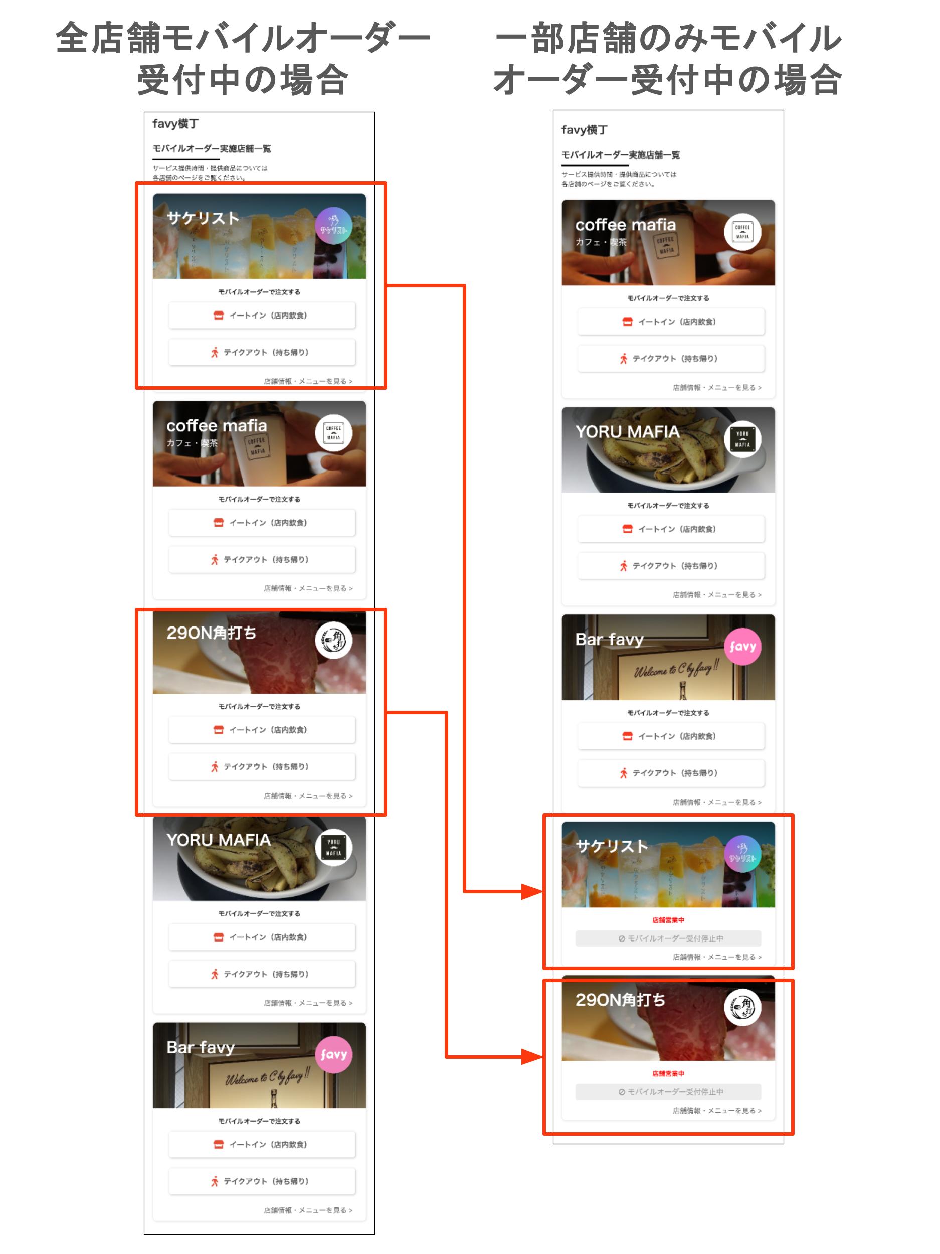 これまでは営業状況に関わらず「館メインページ店舗管理」で設定された順で表示されていましたが、モバイルオーダーを受付中の店舗が優先的に上に表示されるようになりました。