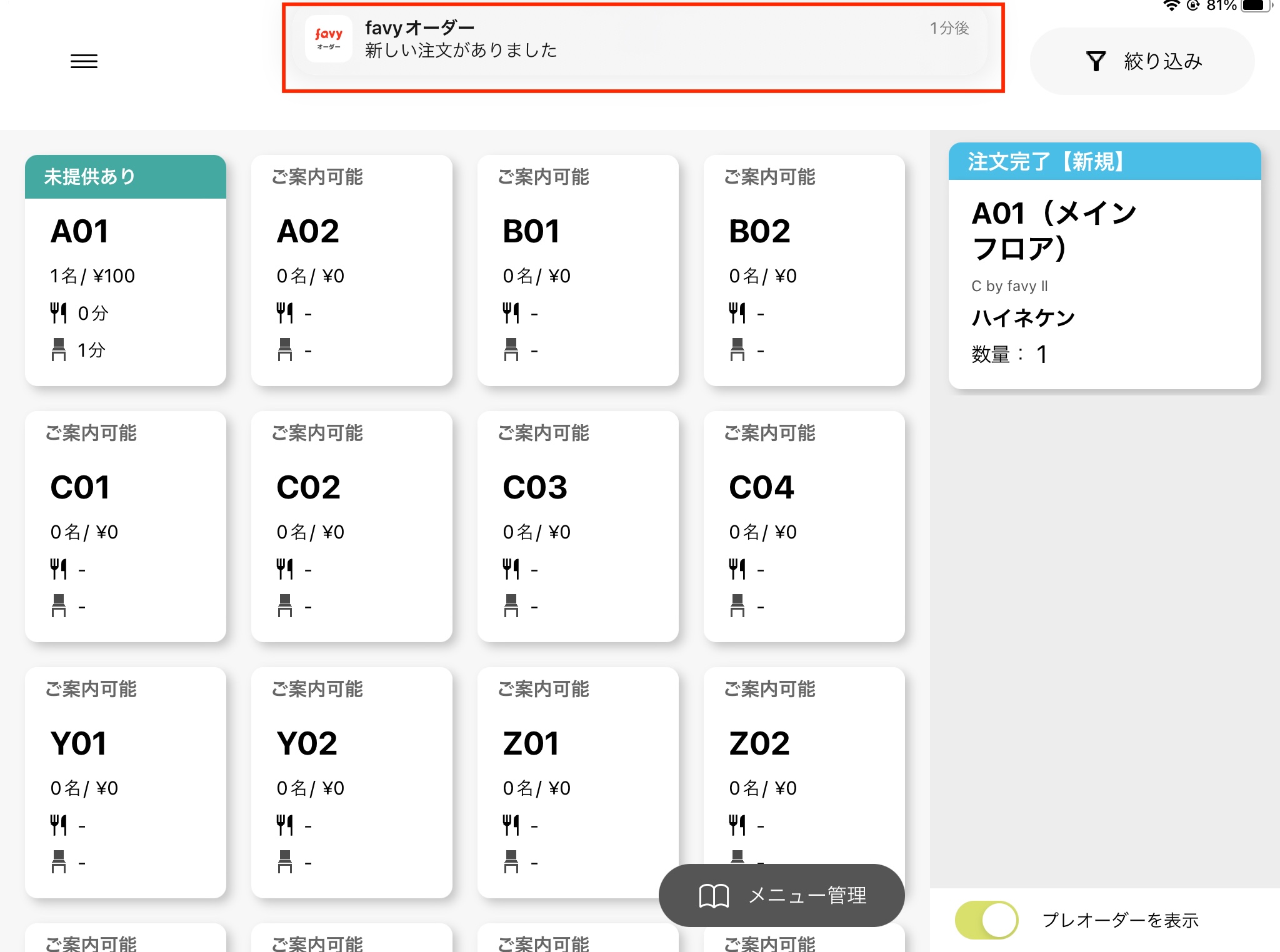 iPadの「設定」より、「favyオーダーアプリ」の「通知を許可」をオンにしてください。