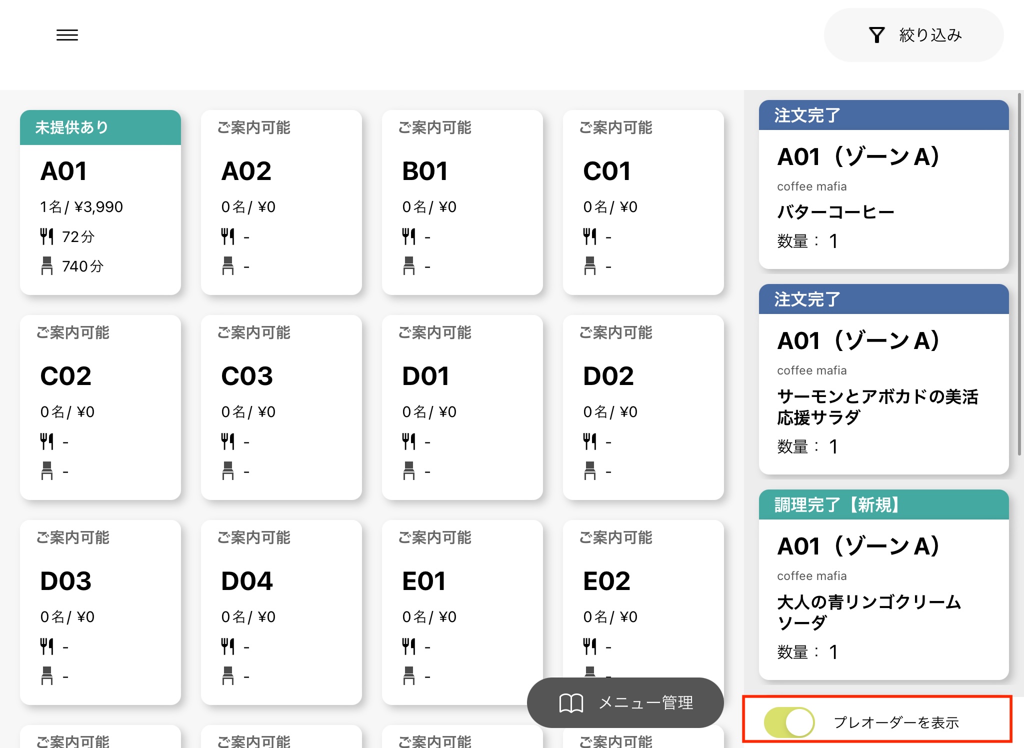 モバイルオーダー(事前決済・プレオーダー)の通知が来ない場合は、待受画面の右下の「プレオーダーを表示」がオンになっているかどうかをご確認ください。