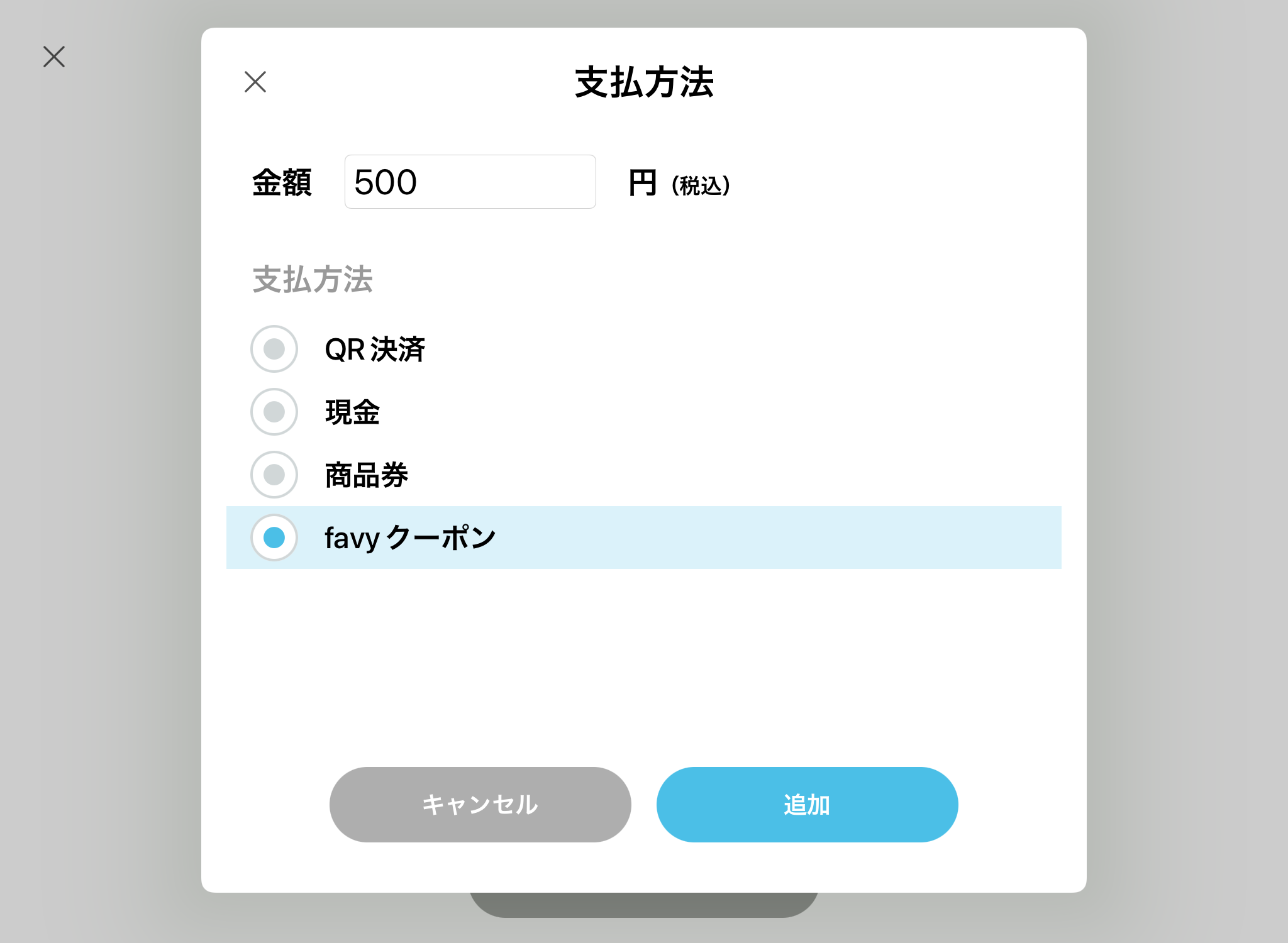 支払方法選択画面にて、金額を入力し、支払方法を選択した上で、「追加」をタップします。