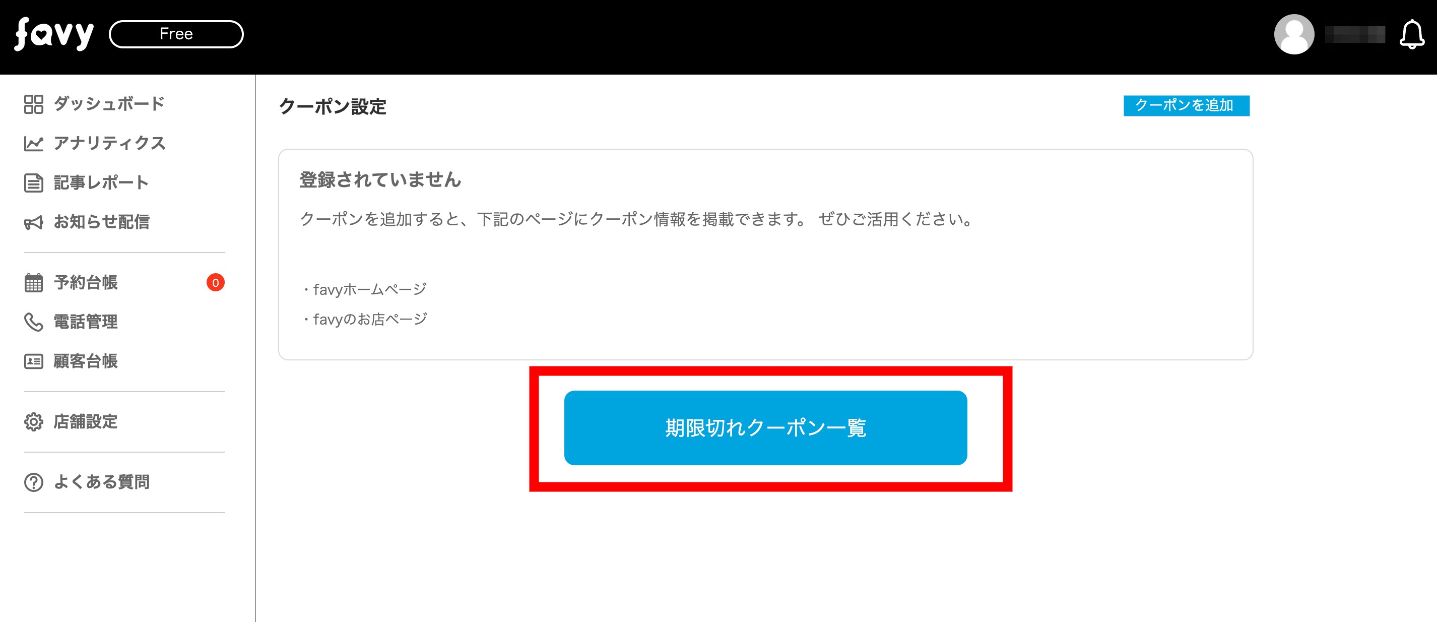 以下の手順にて、favyページ(ホームページ)上にクーポンを表示することが可能です。