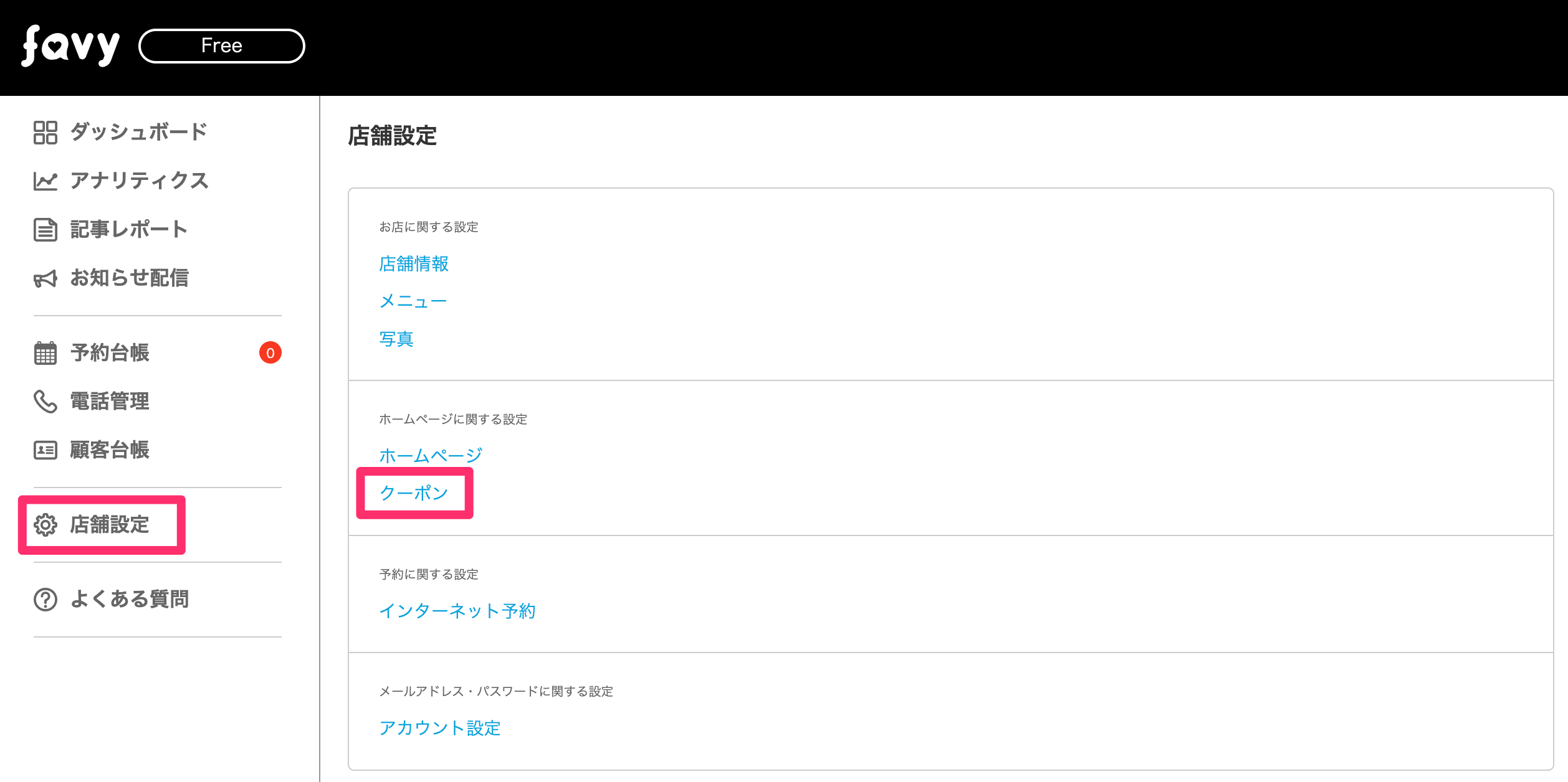 「店舗設定」内の「クーポン」をクリックする。