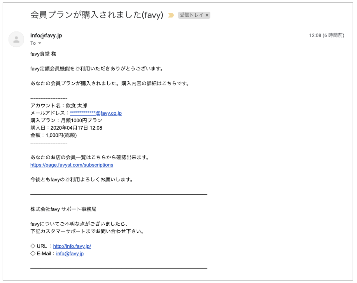 favyに登録いただいた店舗メールアドレス宛に購入の通知が届きます。