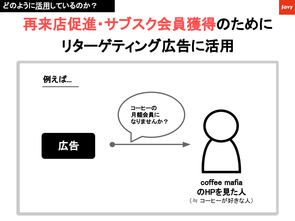 favyのお店紹介記事や独自HPなどへの訪問時に、オンライン上でのユーザ行動のデータを取得できます。そのデータを活用し、適切なリターゲティングが可能。