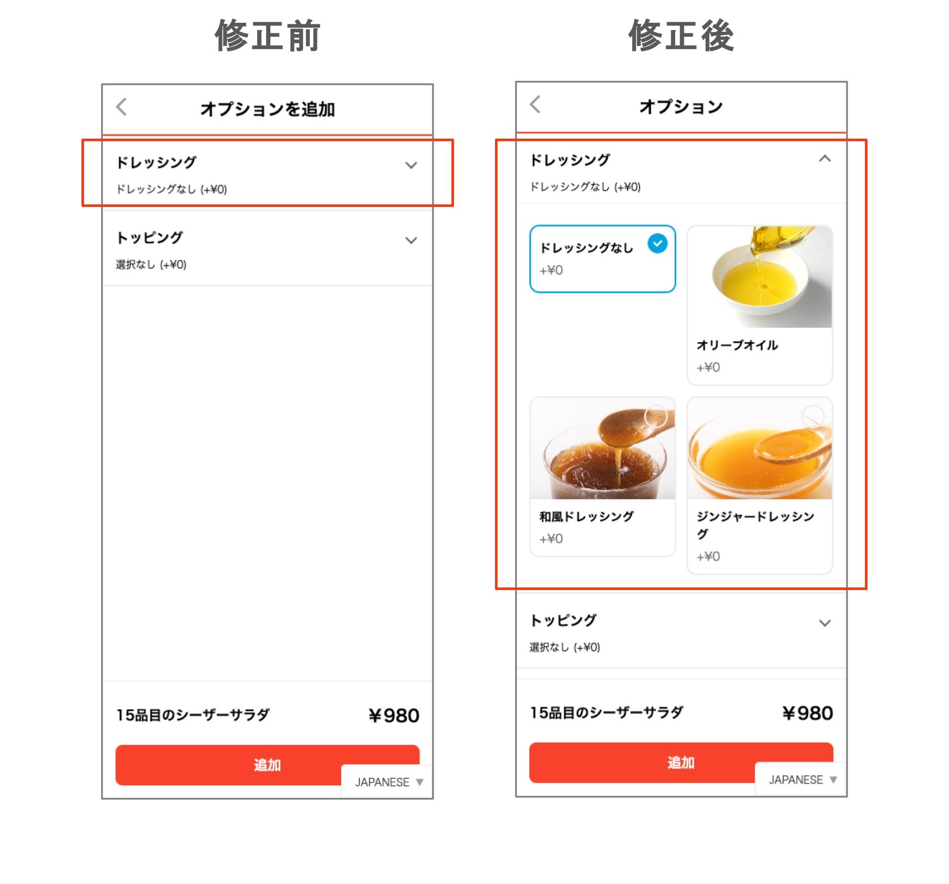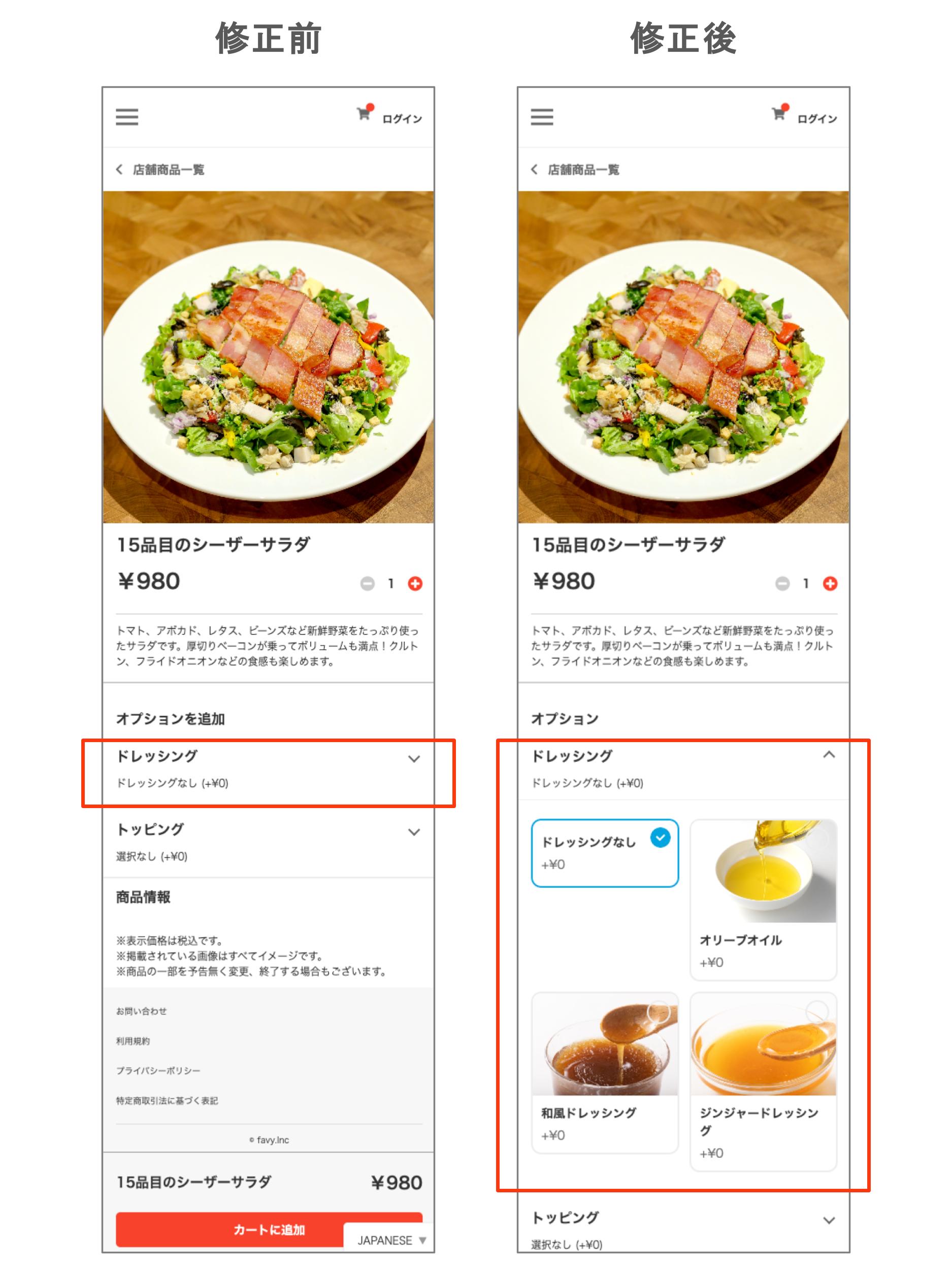 モバイルオーダー:メニューオプションの表示で一番上のオプションの選択肢が全て表示されるようになりました