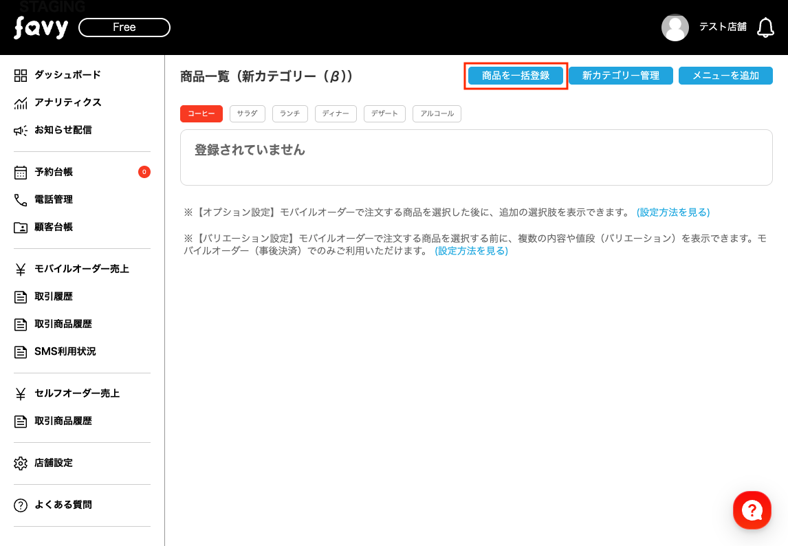 新カテゴリーのメニューページでカテゴリーを作成した後、「商品を一括登録」を選択