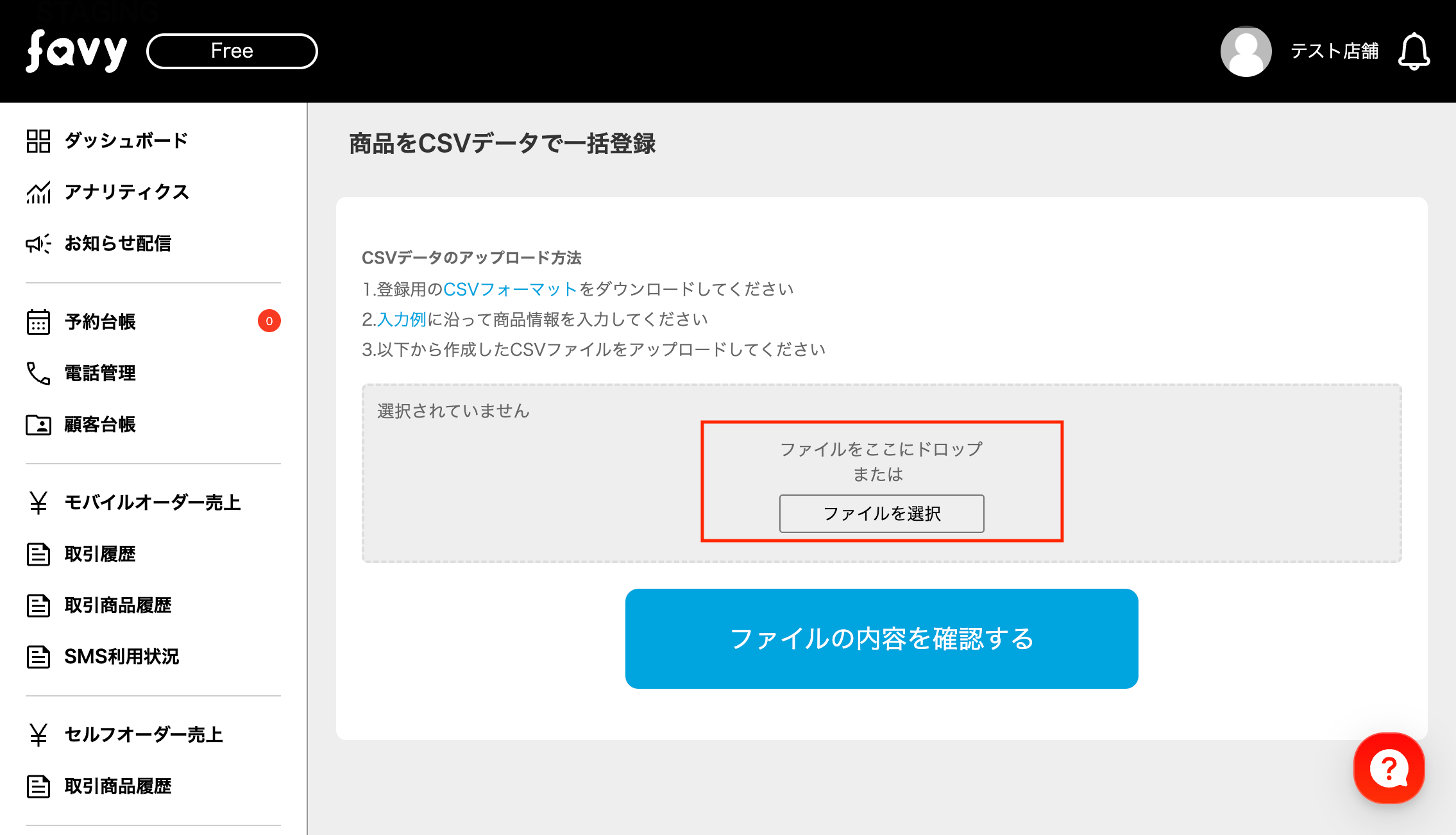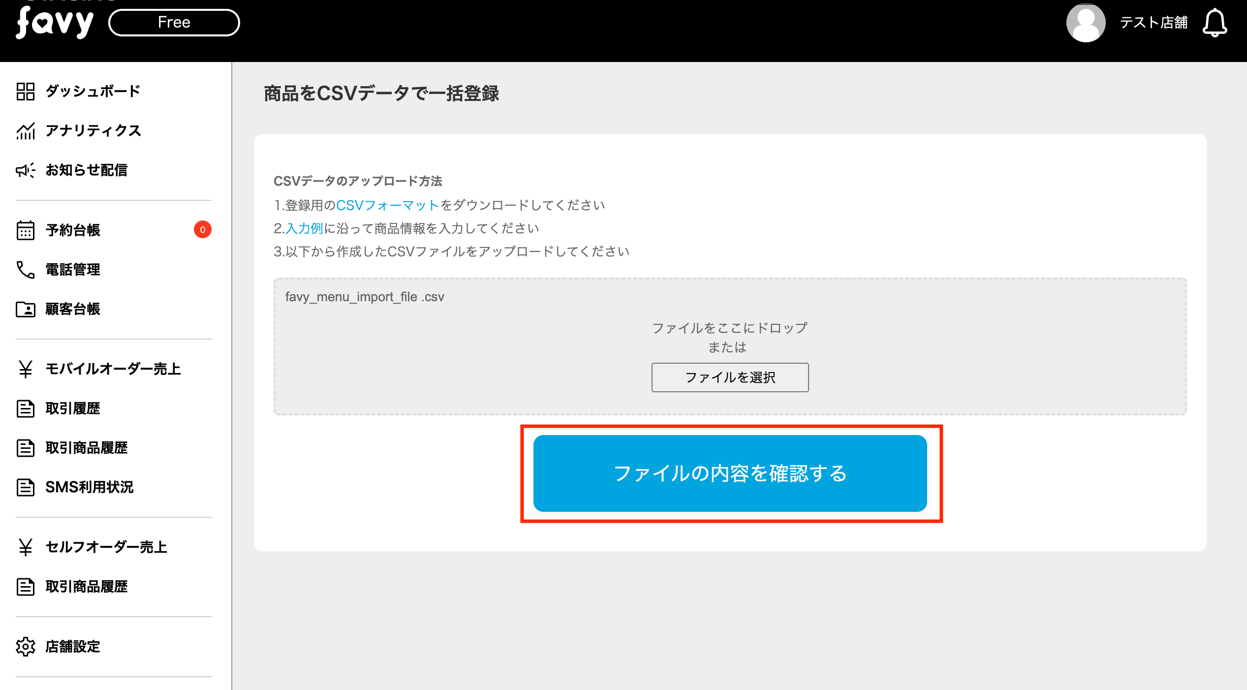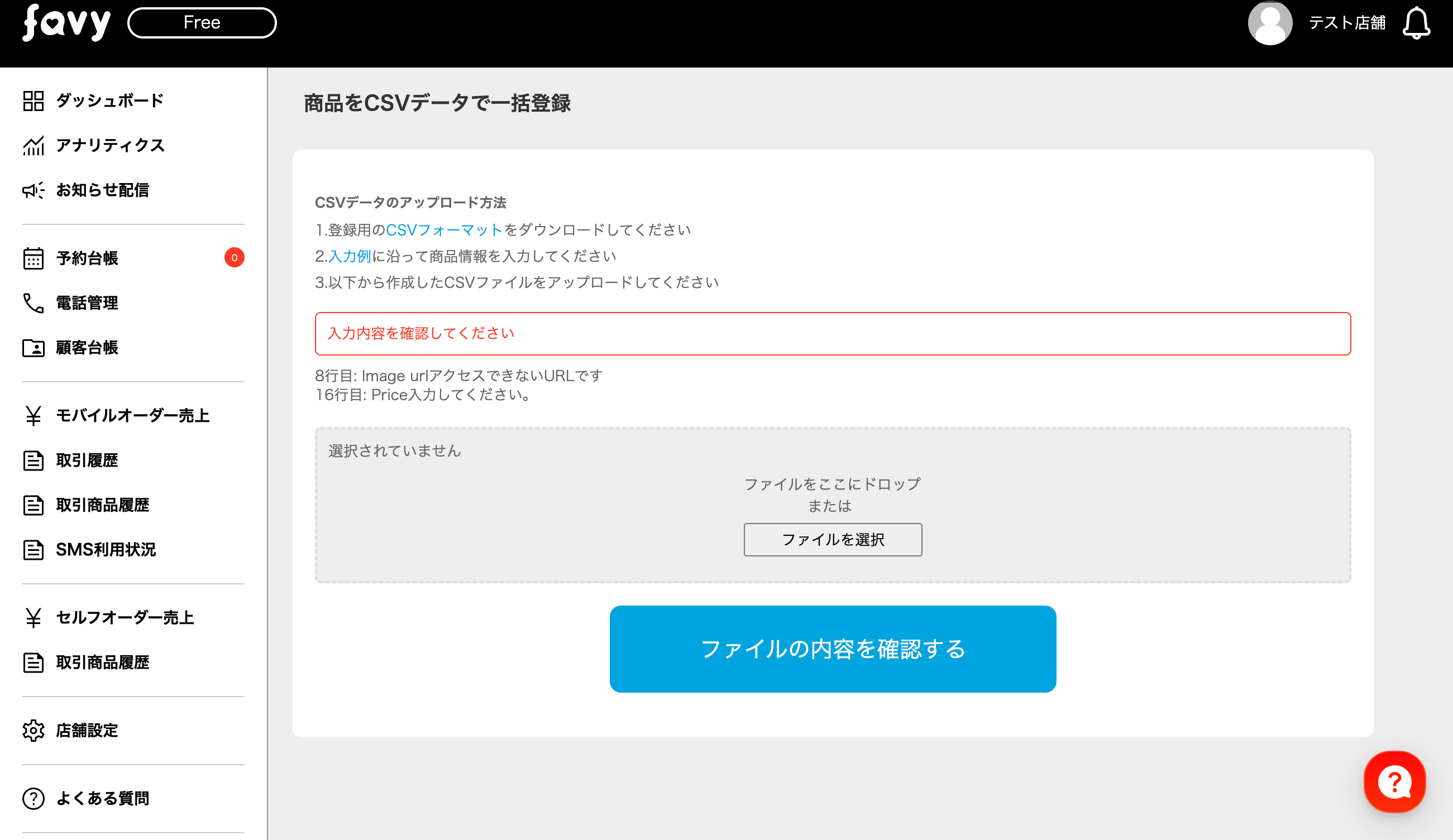 ・CSVデータをアップロードした際、データ内容に不備があった場合エラーメッセージが表示されます。エラー箇所を修正して再度アップロードしてください。