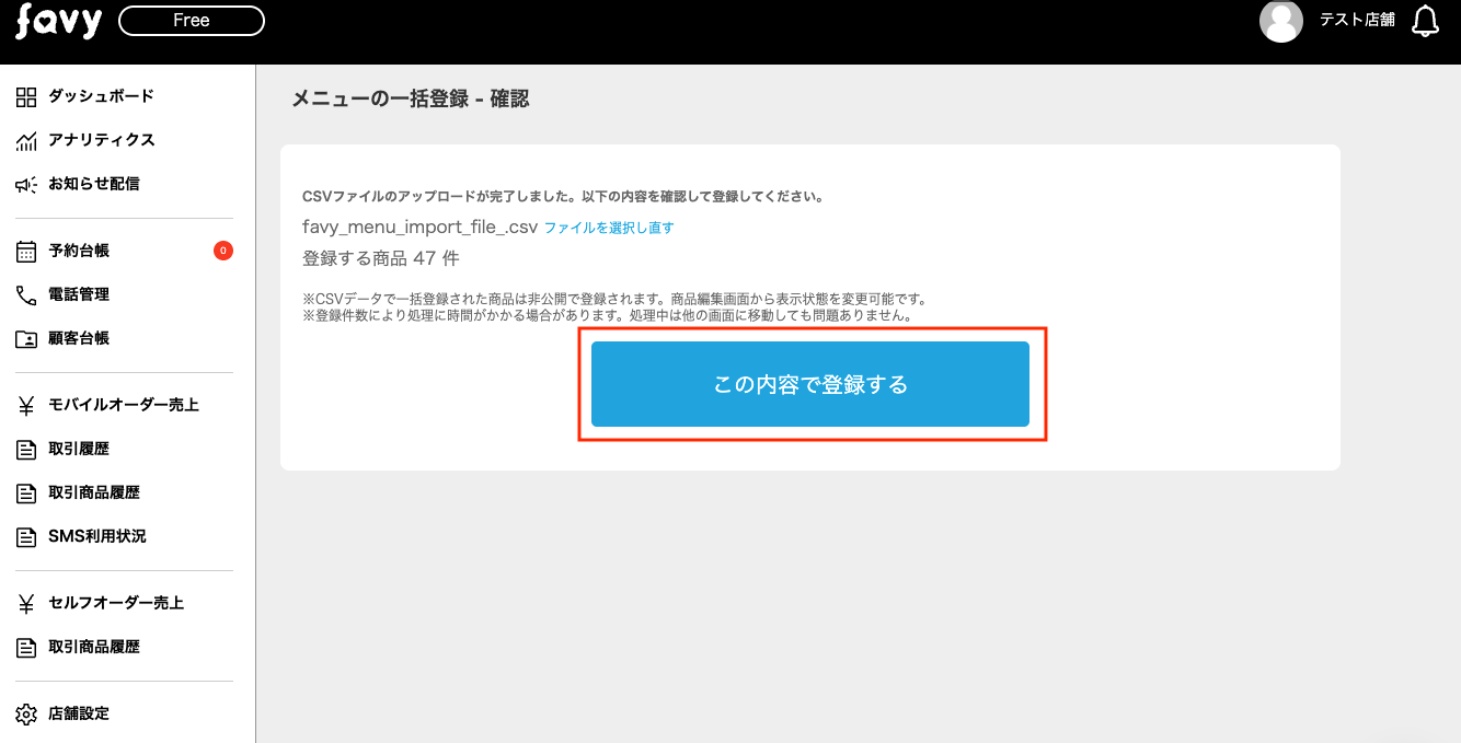 一括登録したメニューは全て「非公開」の状態で追加されます。メニューごとに公開作業を行ってください。