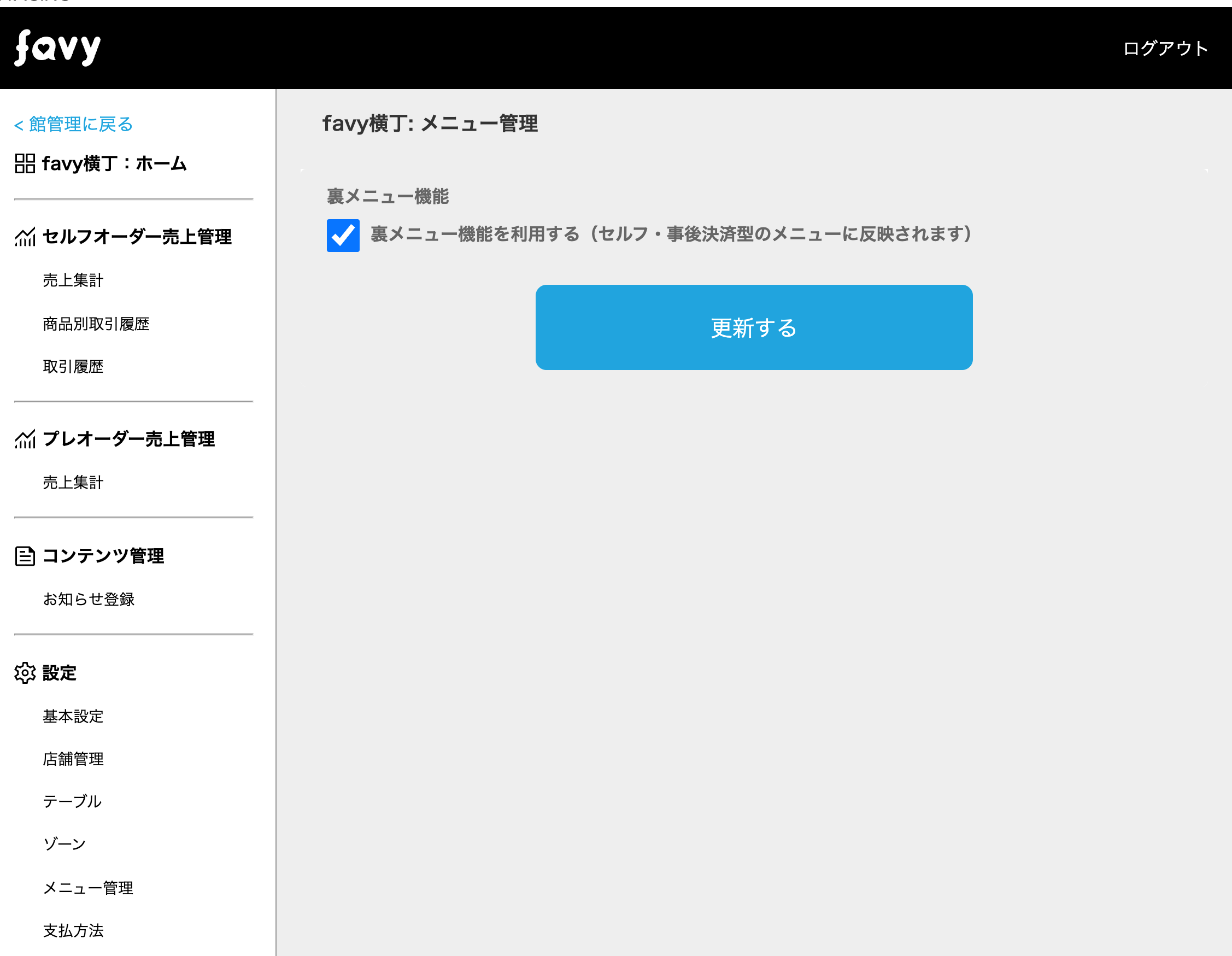 裏メニューとは、お客様画面には表示されずフロアスタッフ(館ログインのfavyオーダーアプリ)からしか注文ができないメニューのことです。