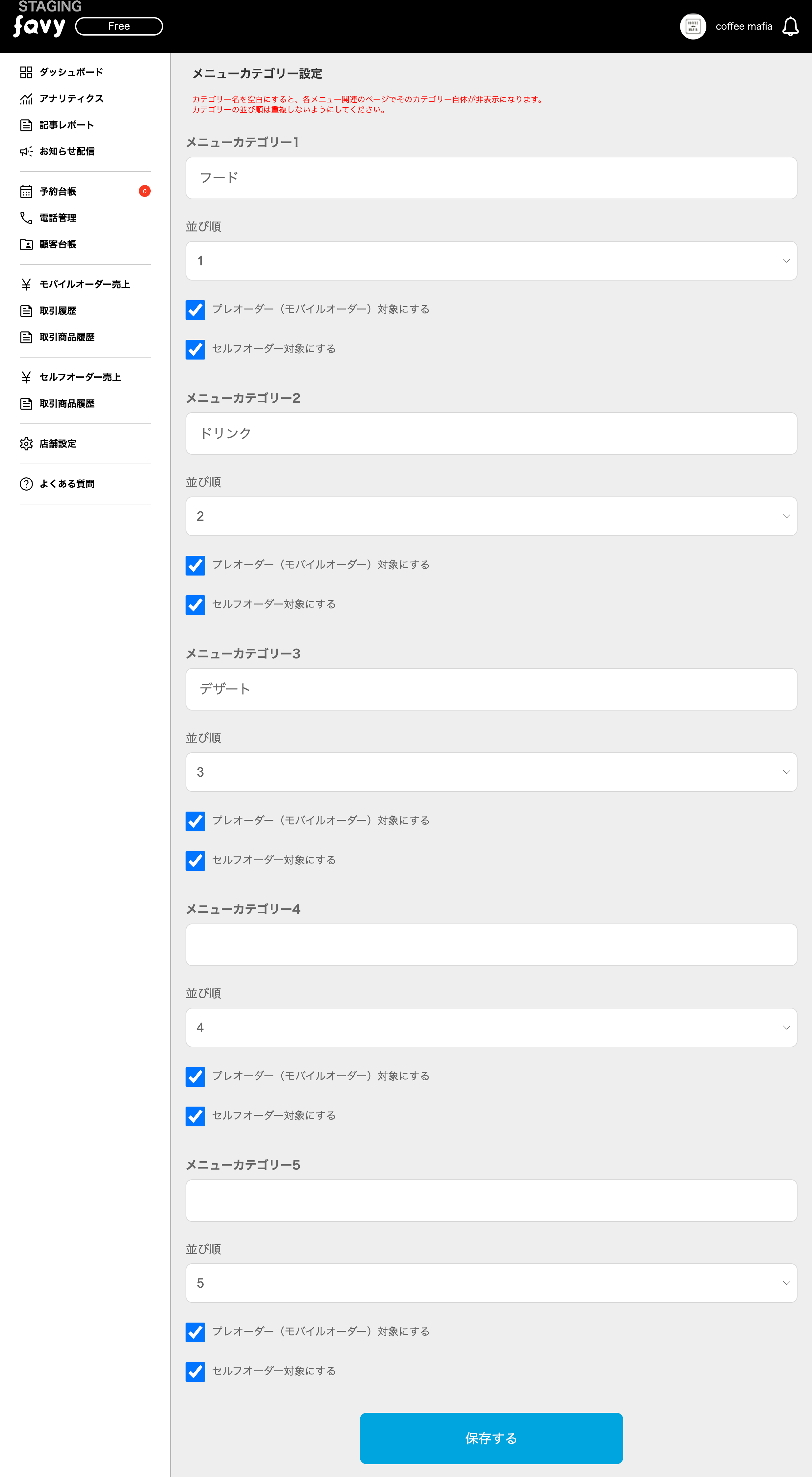 ※チェックを外すと該当のカテゴリーに紐付けたメニューがプレオーダーに表示されなくなります
