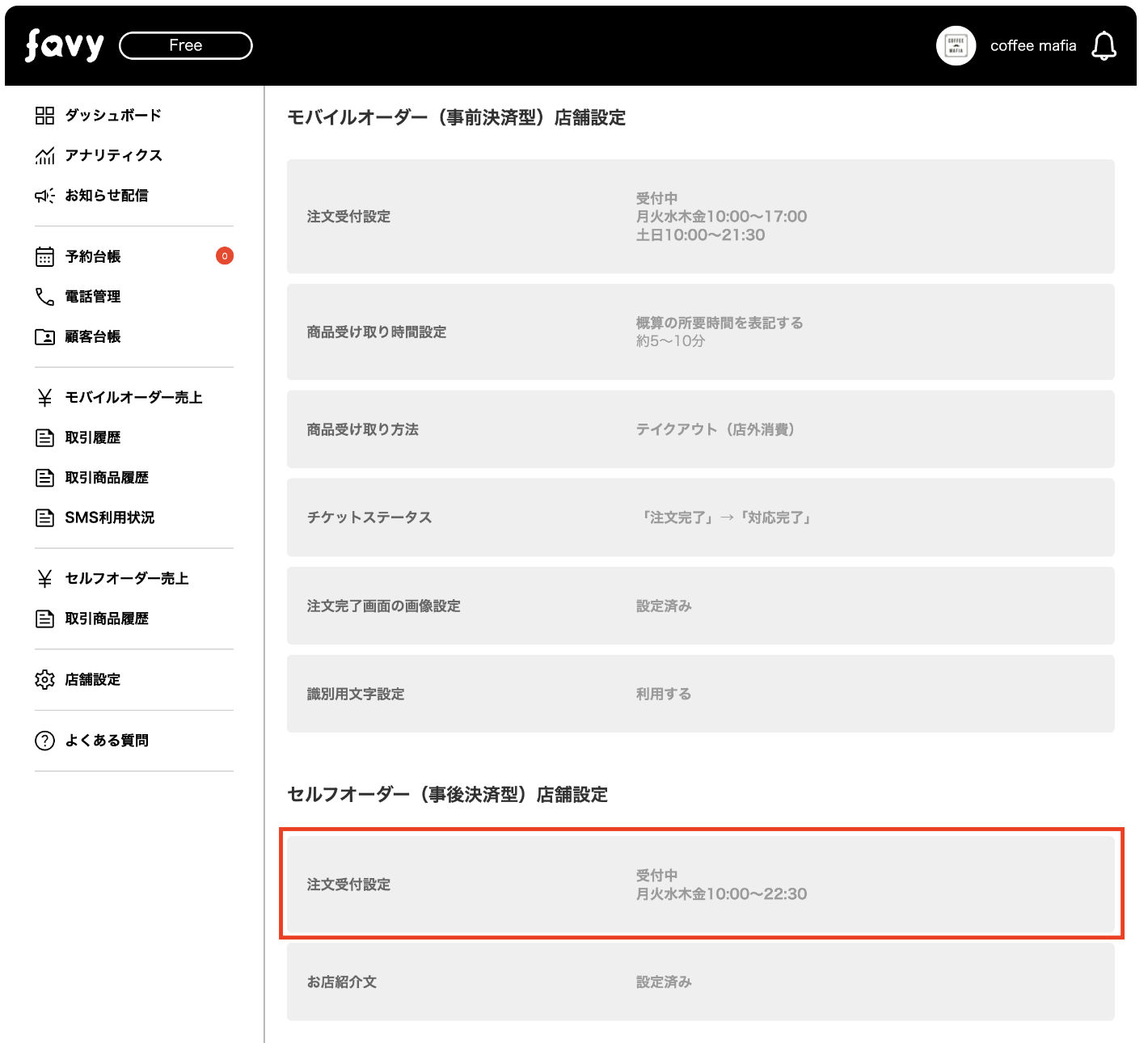 favyモバイルオーダー(事後決済)の受付時間設定を「自動切替」に設定することができ、定休日や営業時間外の受付停止ミスを防止しすることができます。