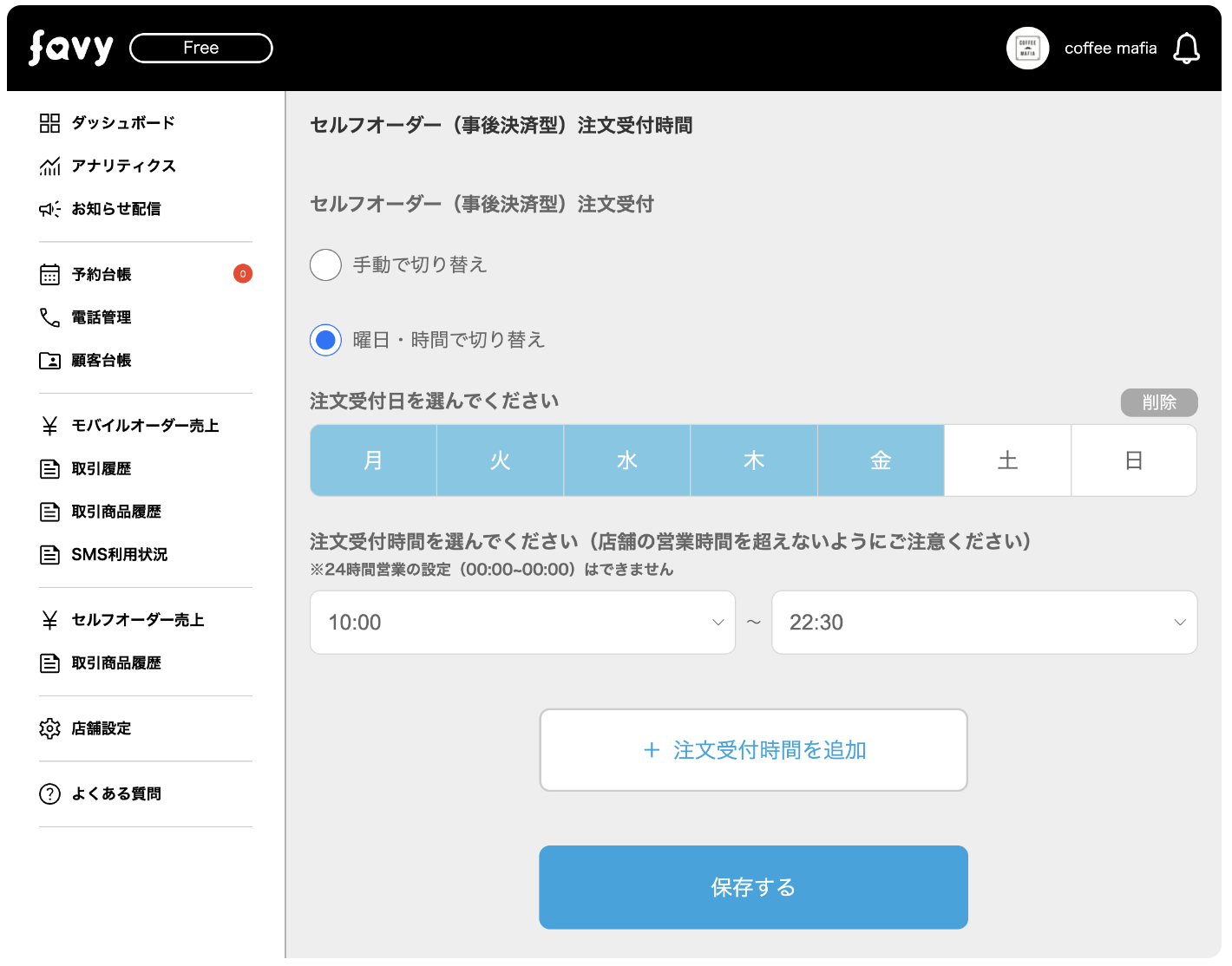 favyモバイルオーダー(事後決済)の注文受付設定 「手動で切り替え」「曜日・時間で切り替え」を選択することができます。