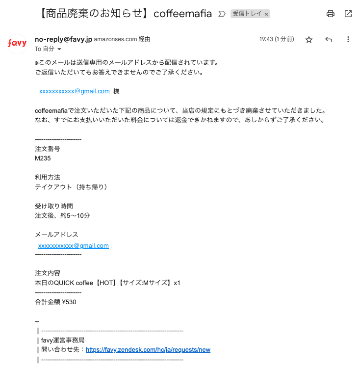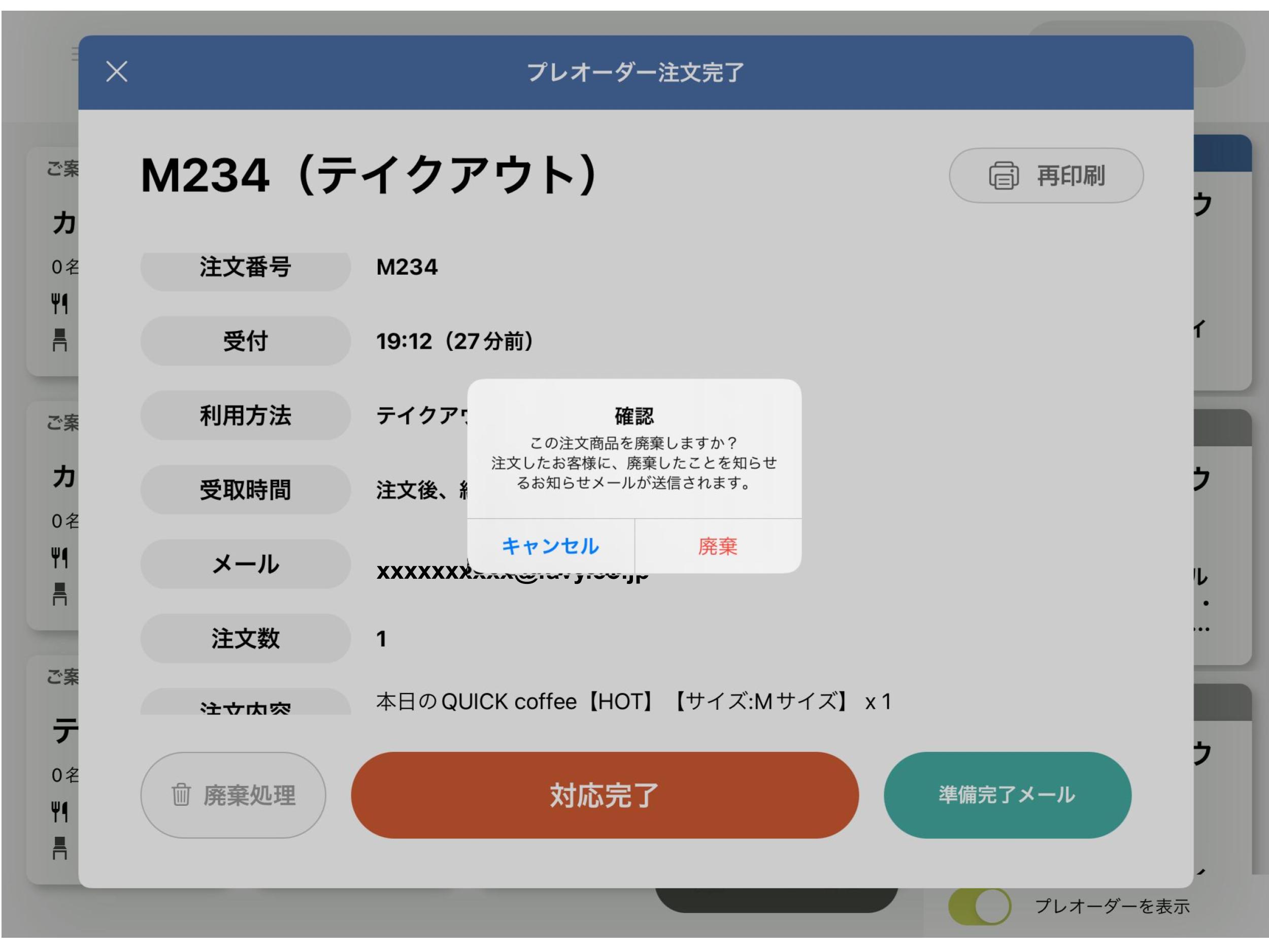 注文時間以降、一定時間が経過してもお客さまが来店されない場合、商品を廃棄することをお知らせするメールを送ることができます。