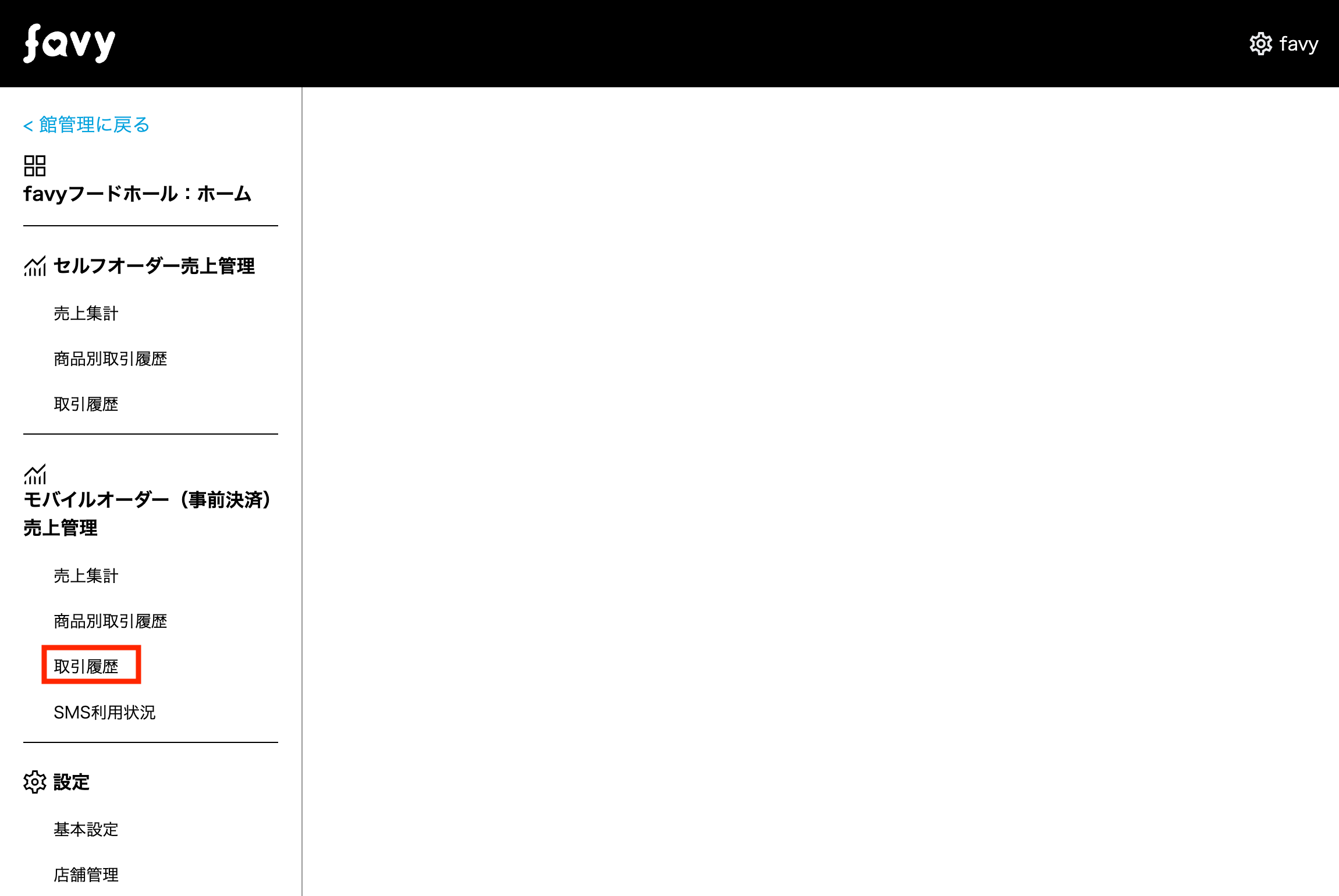 館管理画面のトップページの「モバイルオーダー(事前決済)売上管理」より「取引履歴」を選択します。