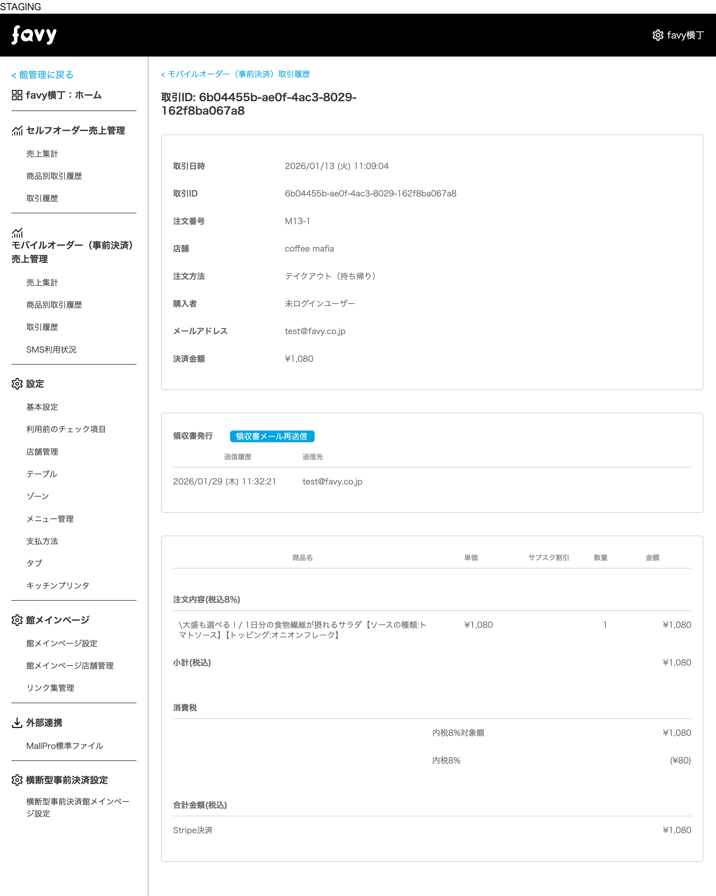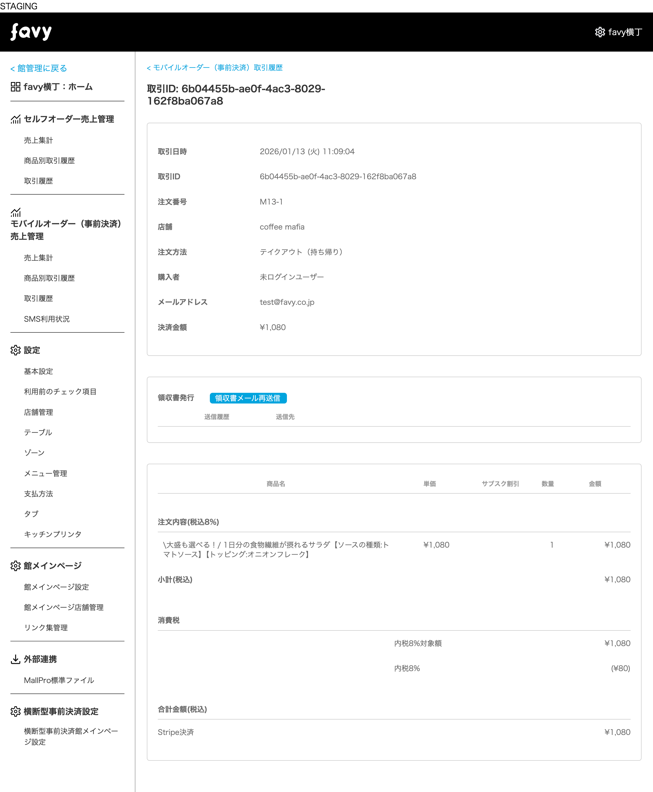 注文された日時や内容、支払方法、領収書発行の有無、決済時のメールアドレスなどが表示されます。