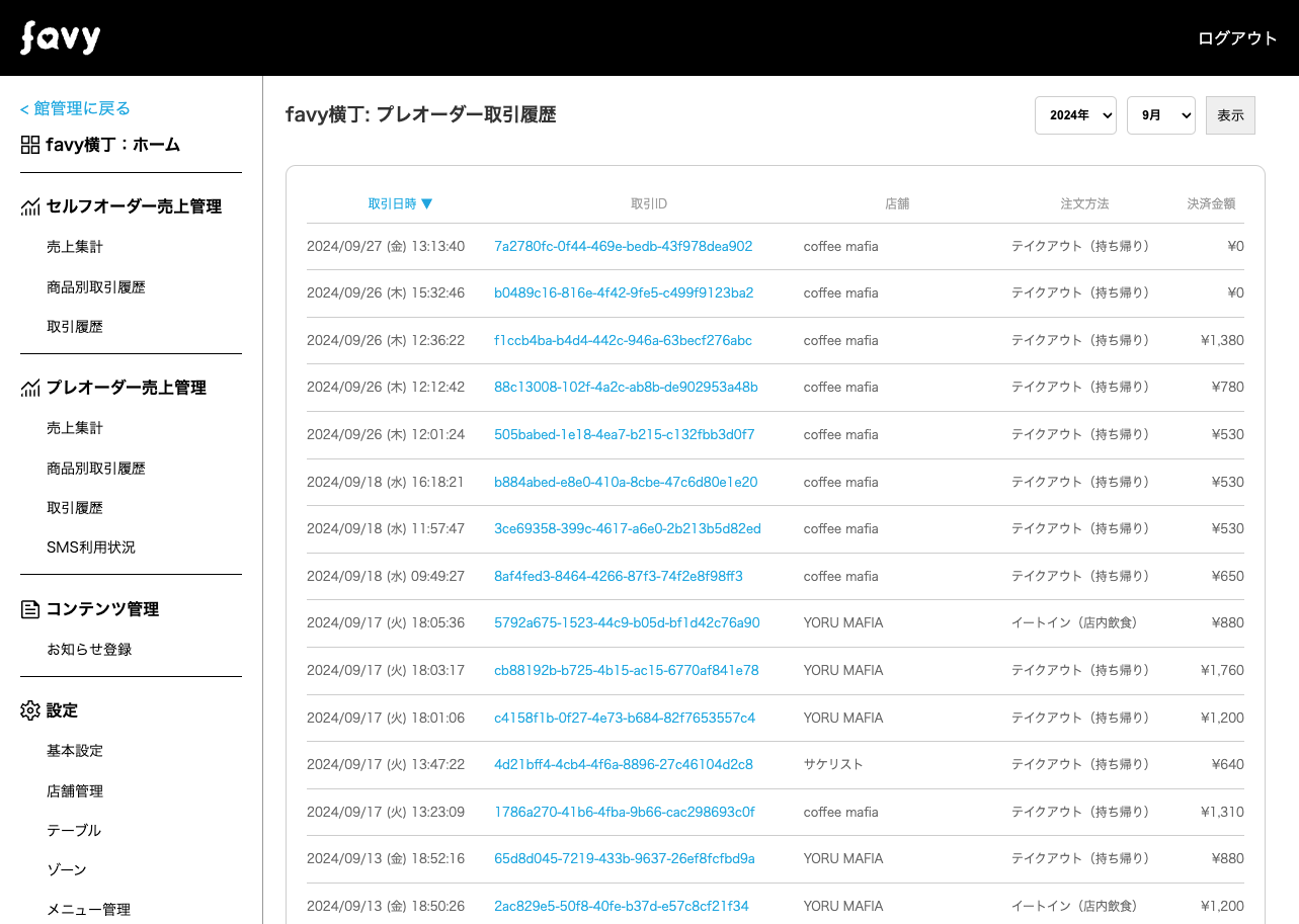 館に所属している店舗の取引を一覧で確認することができます。取引IDをクリックすることで、個別の取引の詳細を確認することができます。