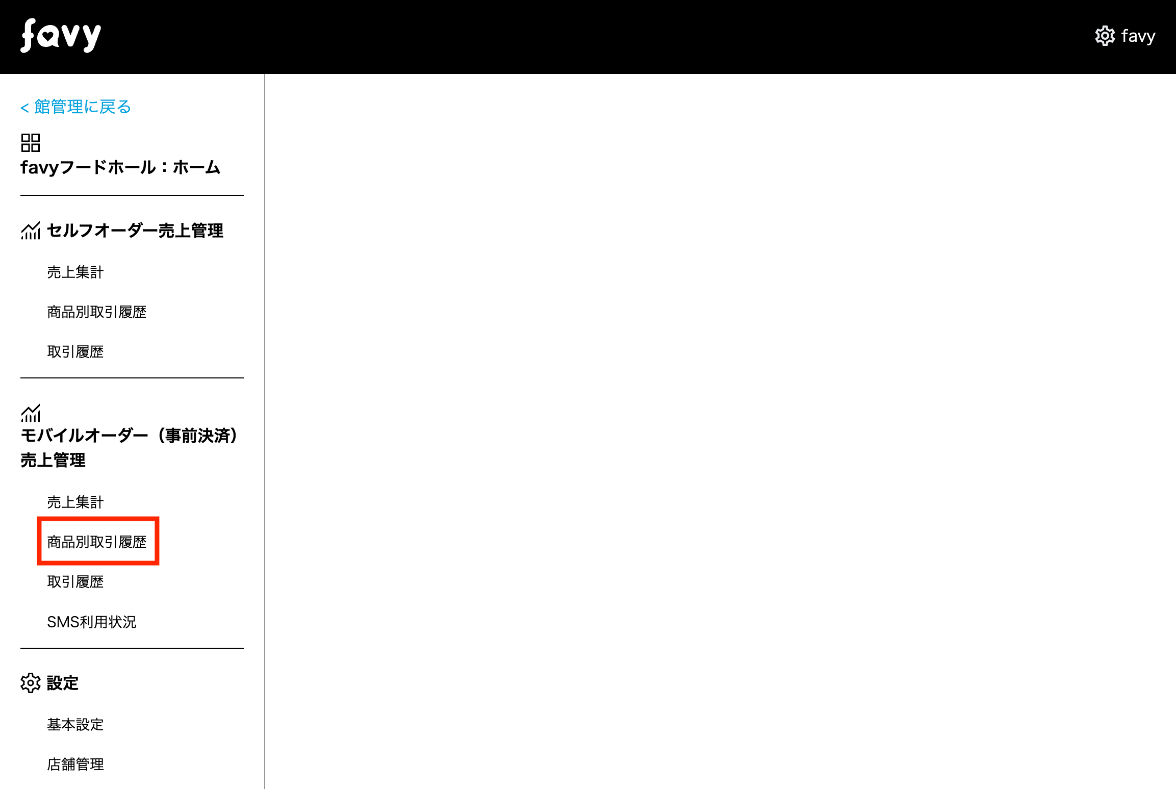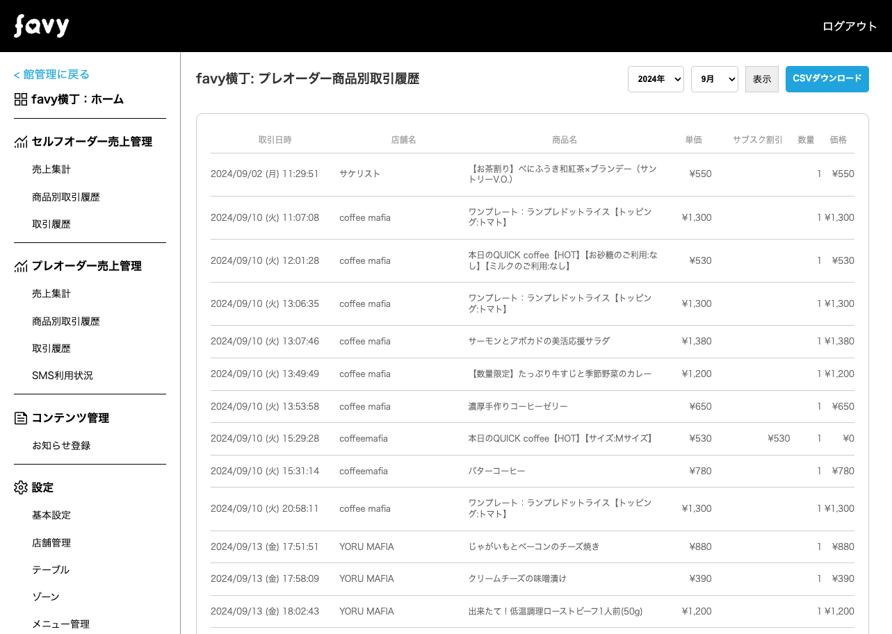 favyモバイルオーダー(事前決済・プレオーダー)の商品別取引履歴を確認する画面です。