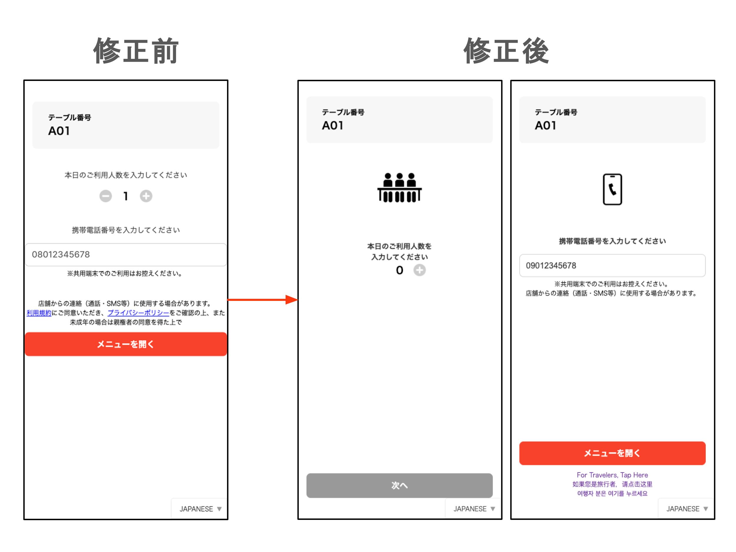 この度、モバイルオーダー(事後決済)のお客様画面で最初にご入力いただく「ご利用人数」と「電話番号」の画面を修正しました。お客さまにとっては入力項目がわかりすく、店舗さまにとってはより正確な人数が把握できるように改善されています。