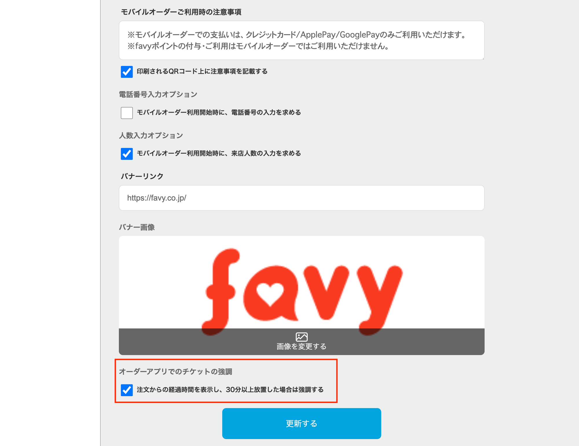 2.「オーダーアプリでのチケットの強調」にチェックを入れ更新