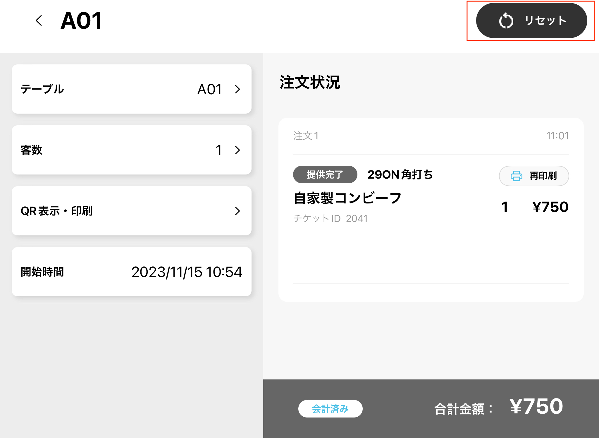 リセットすると、「1.」の状態に戻り次のお客さまをご案内できるようになります。