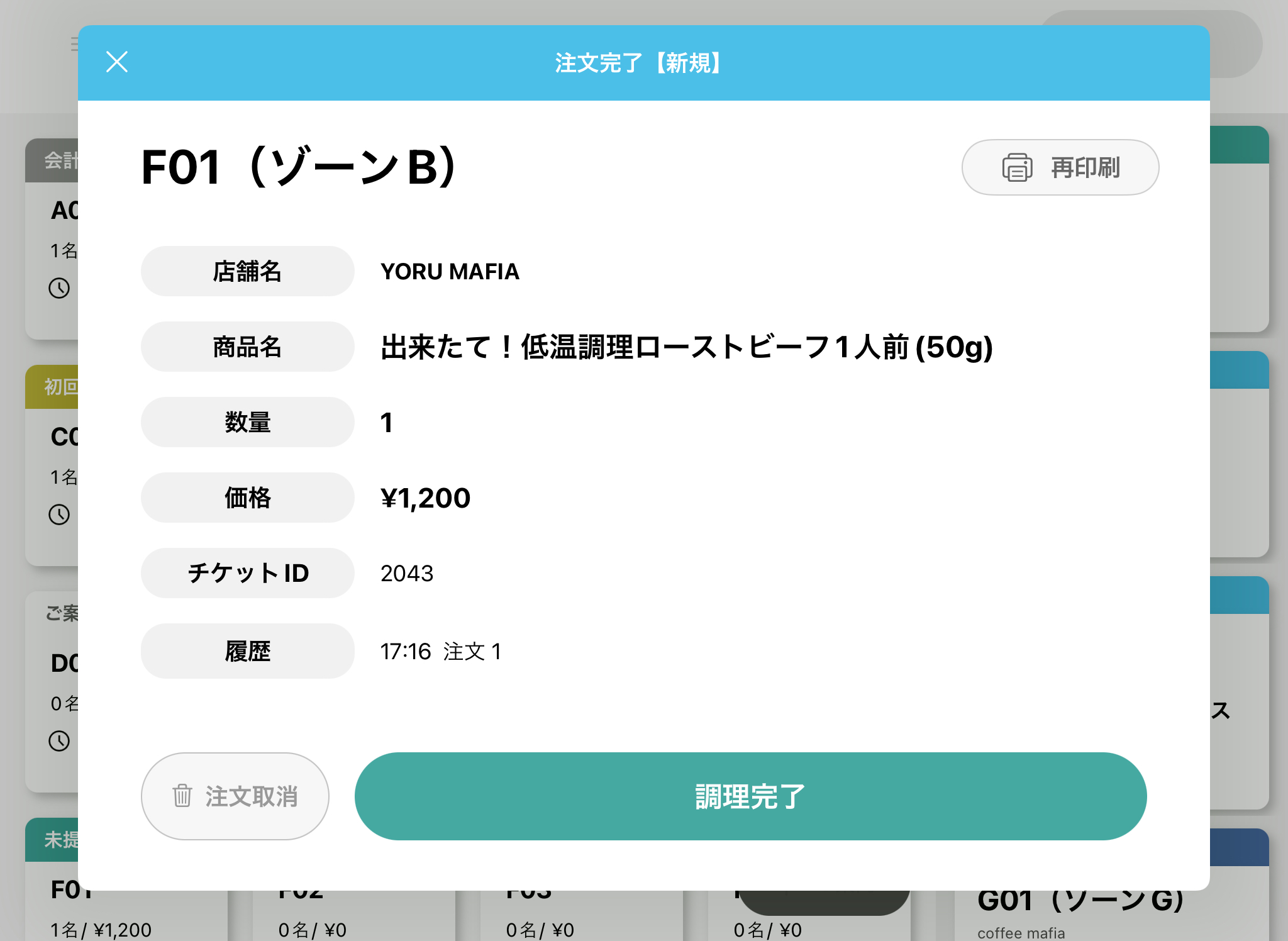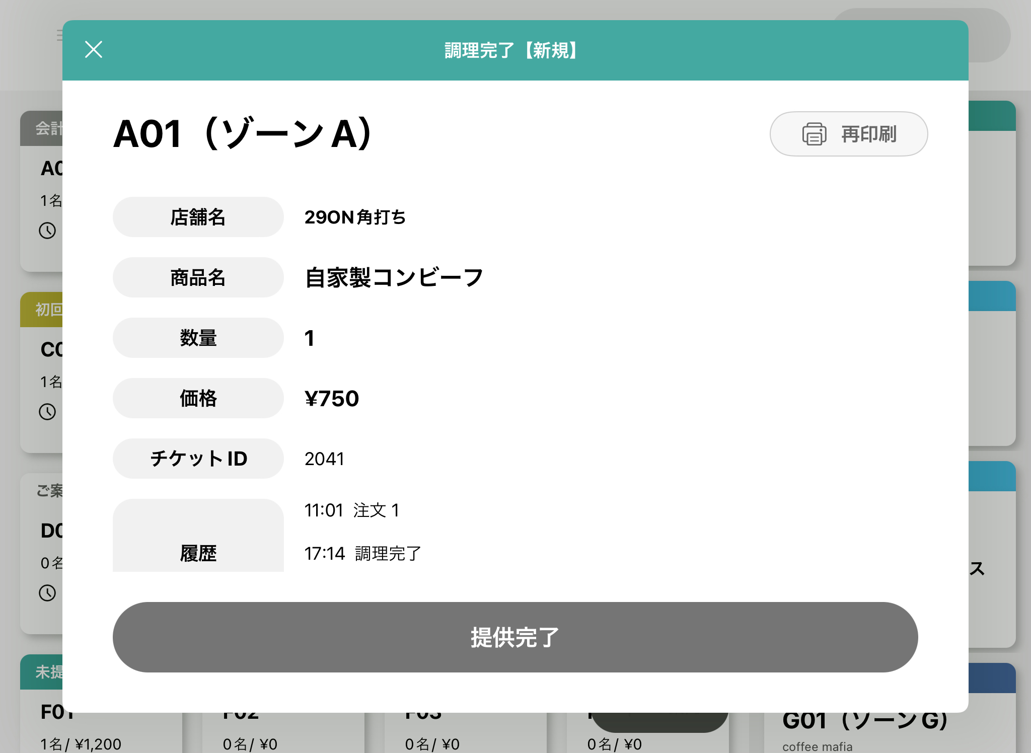 調理が完了したら「調理完了」を選択するとフロアスタッフの画面に通知が飛びます。