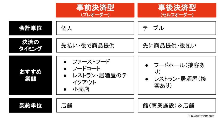 事前決済(プレオーダー)と事後決済(セルフオーダー)の2種類あります。