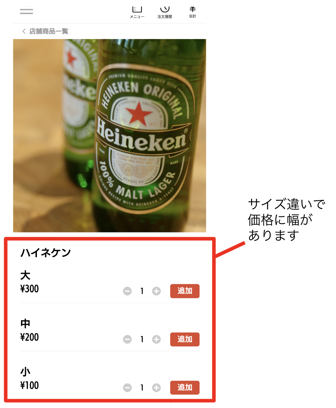 例)ドリンクで「大・中・小」のサイズがある→小の価格が表示
