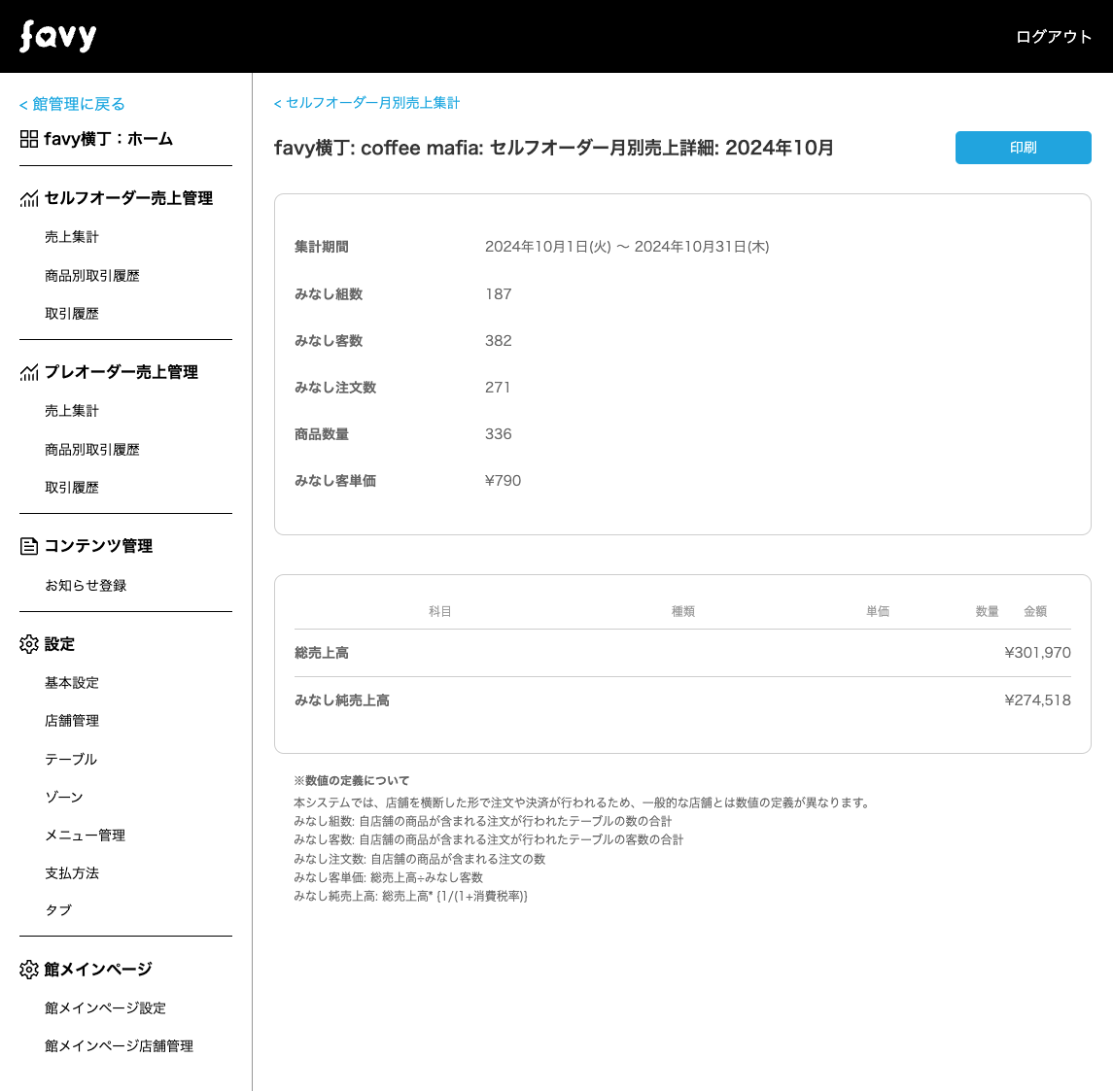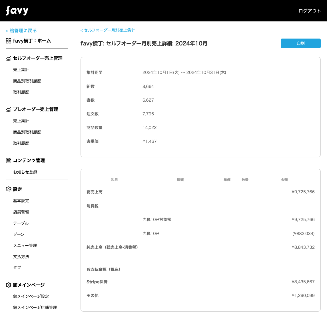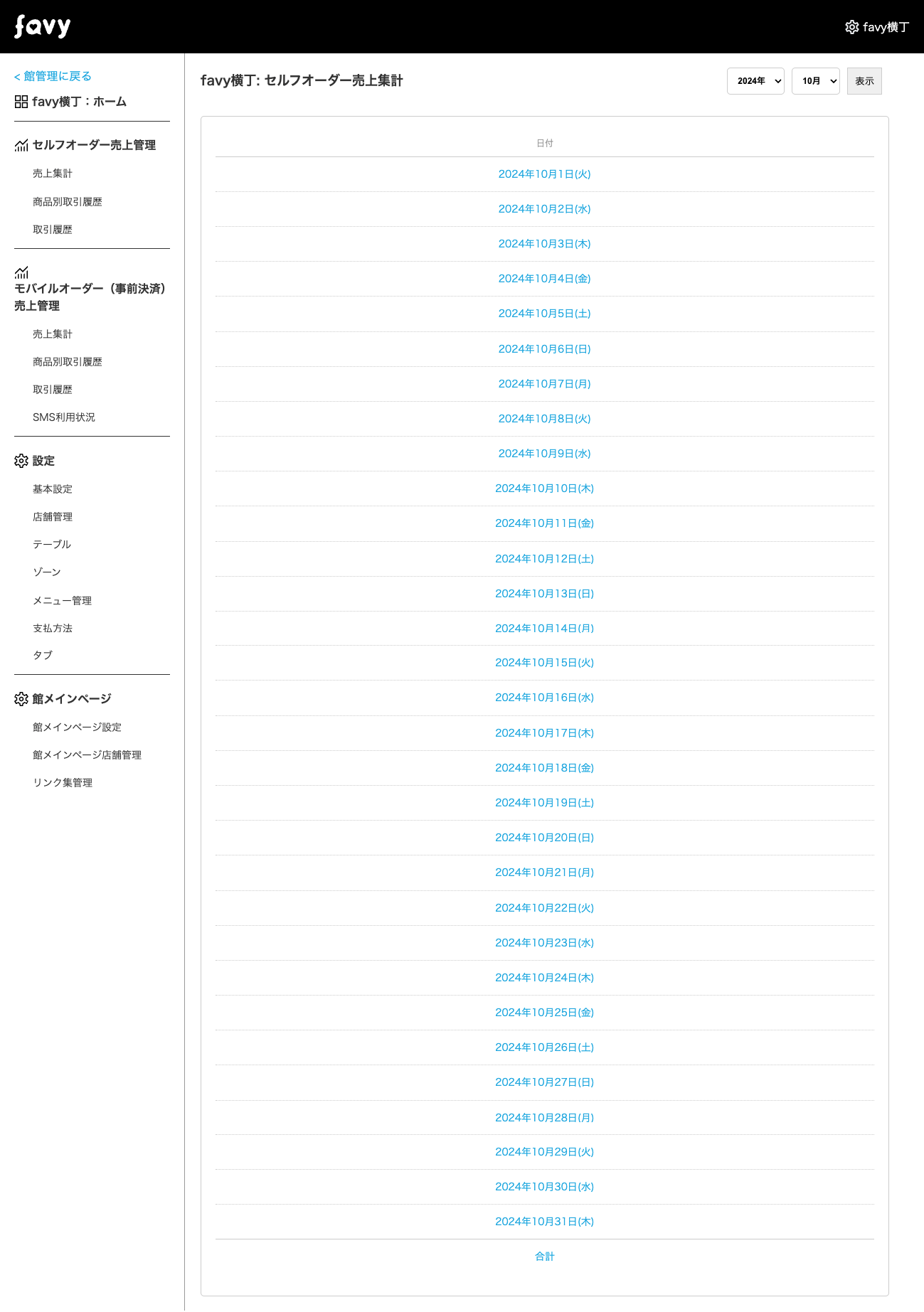 favyモバイルオーダー(事後決済・セルフオーダー)の売上を確認する画面です。