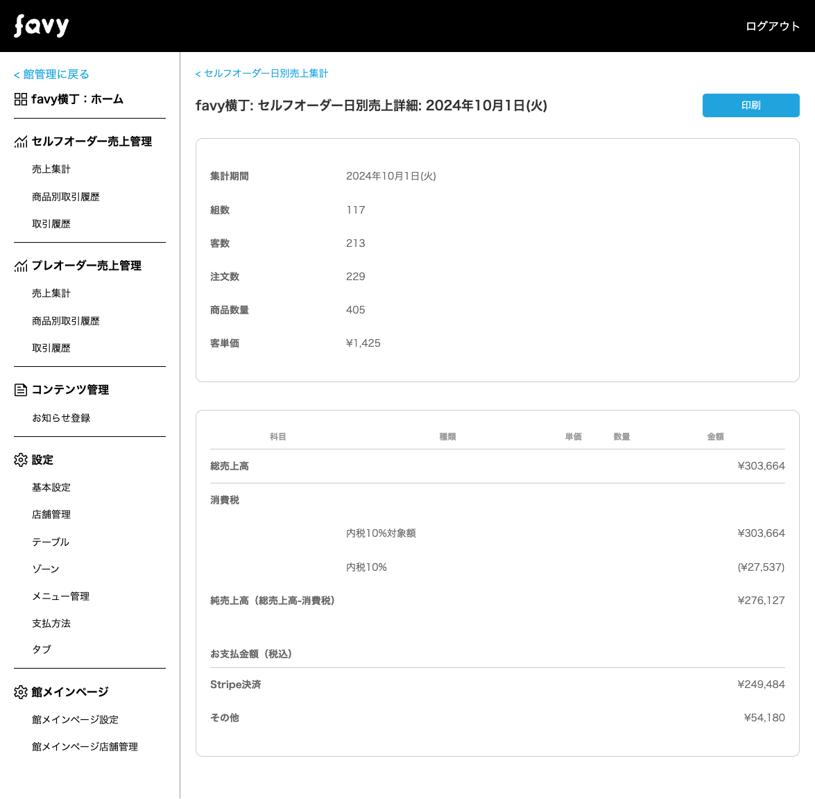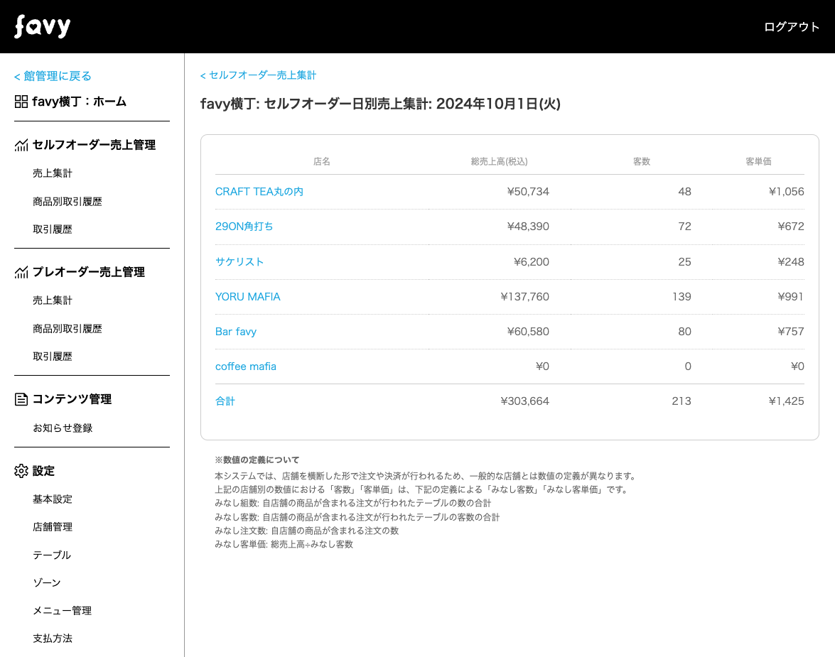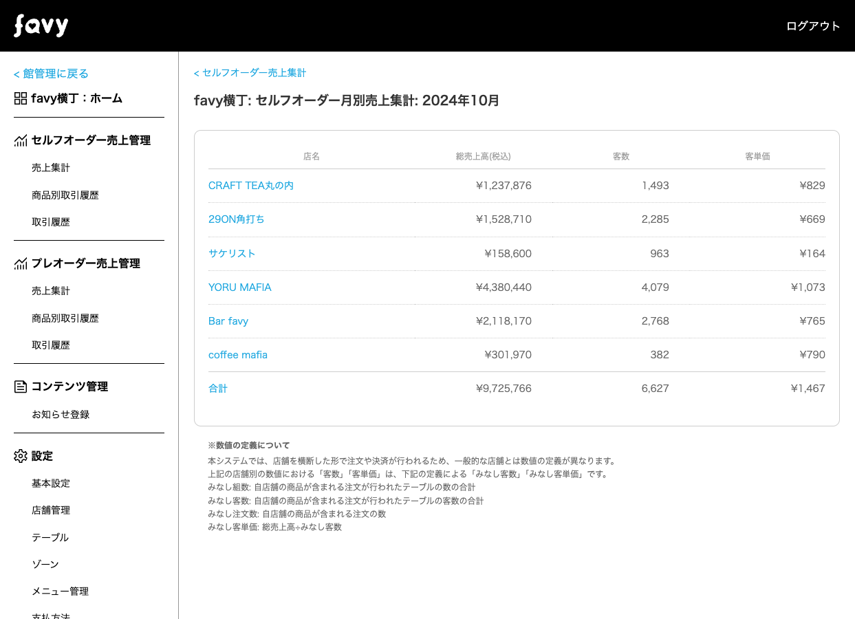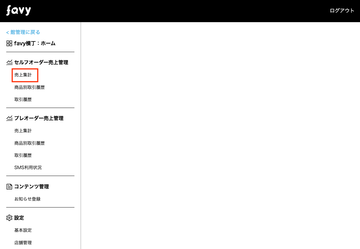 favyモバイルオーダー(事後決済・セルフオーダー)の売上を確認する画面です。