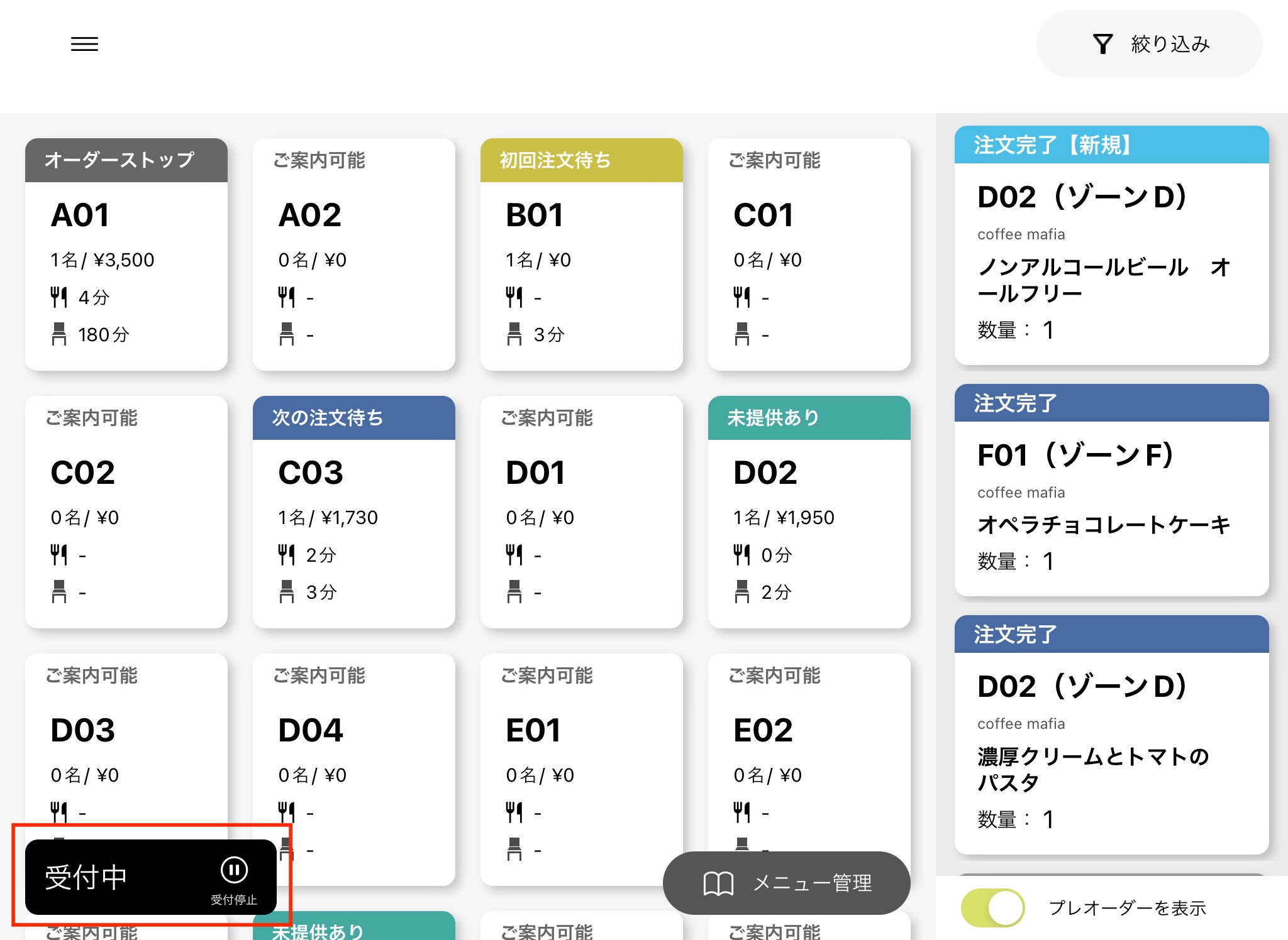 画面右上の「再開」ボタンか画面左下「受付停止中」のボタンを選択します。