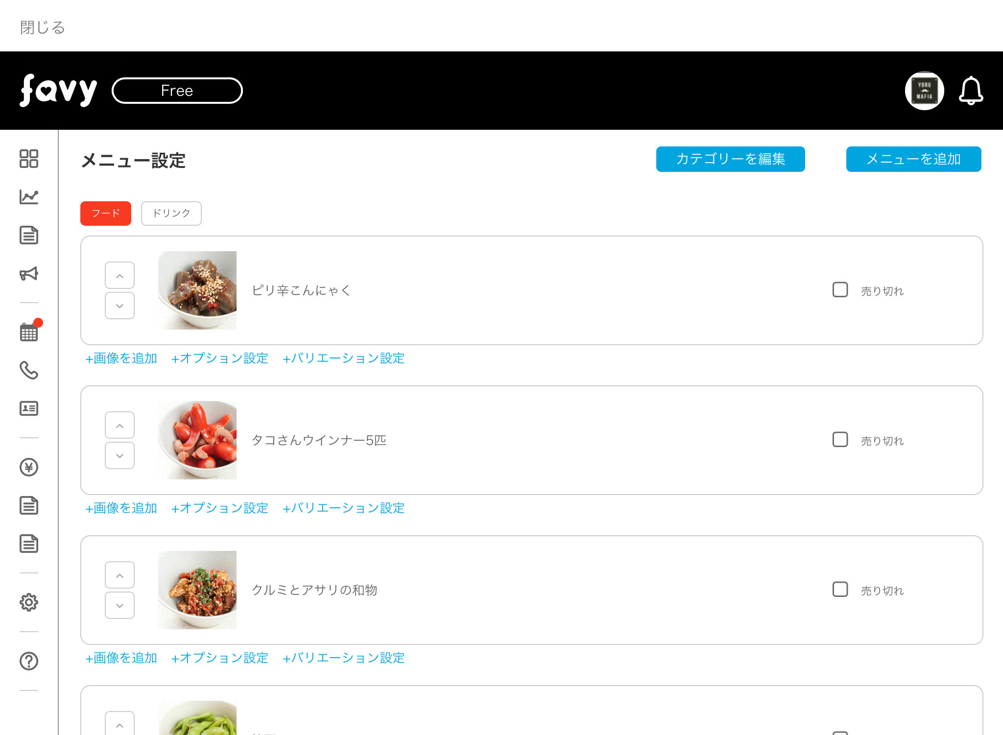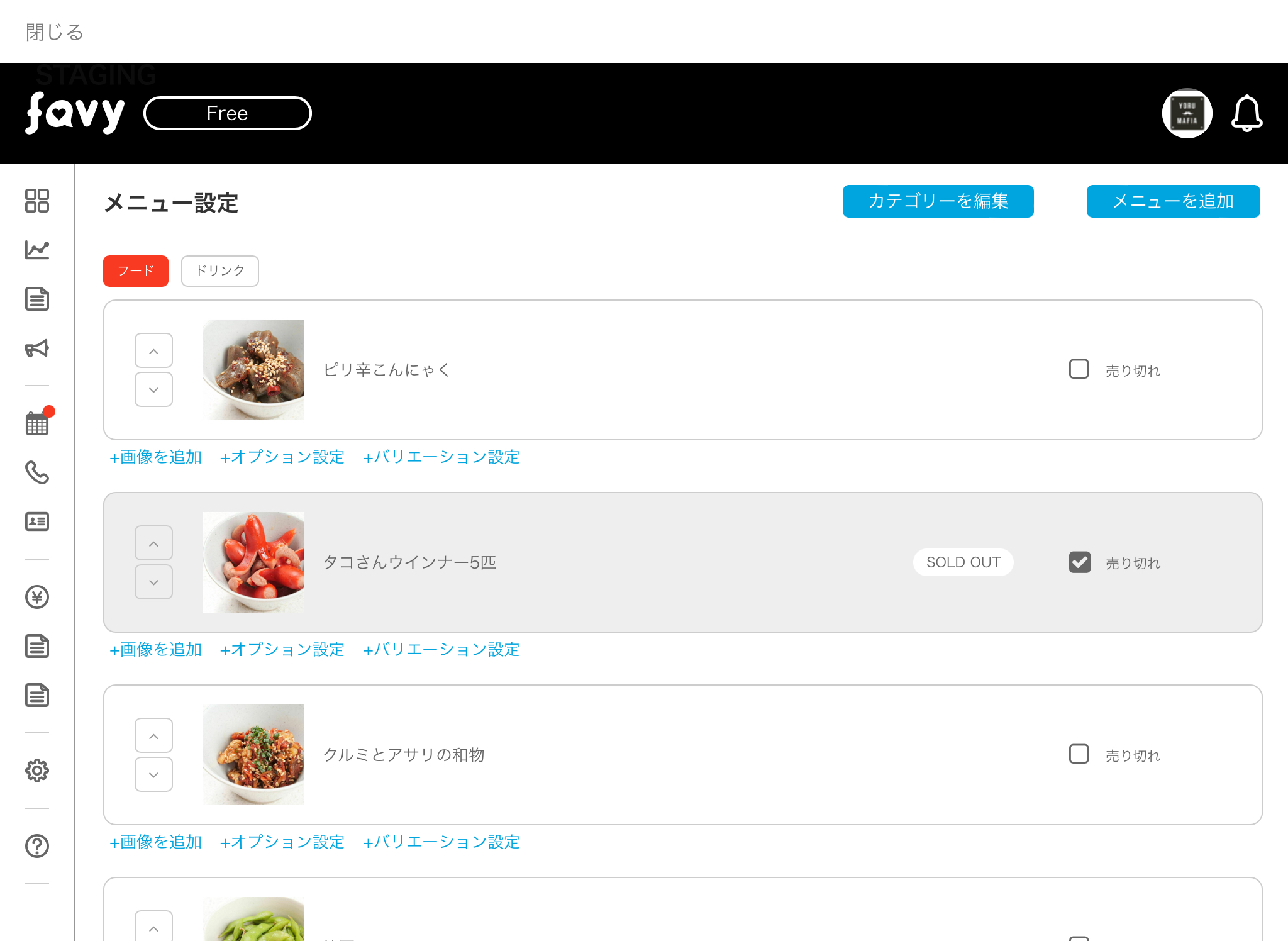 売り止めしたメニューはメニュー一覧からグレーアウトし「SOLD OUT」と表示されています。