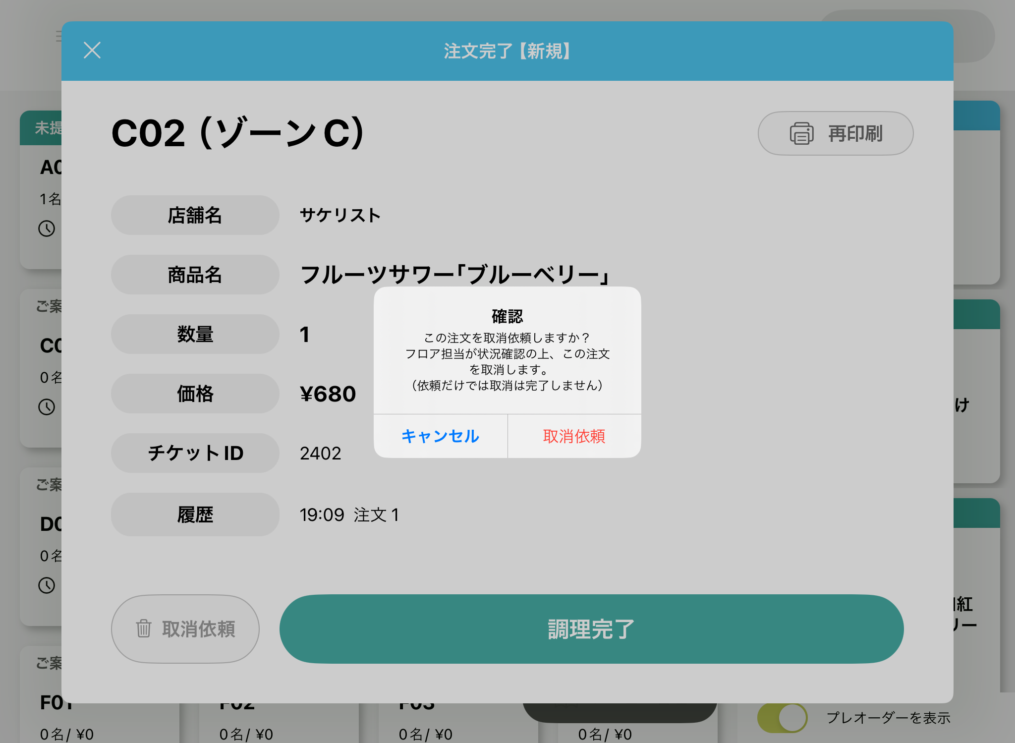 フロアスタッフがお客さまに確認の上「注文取消」を操作します。