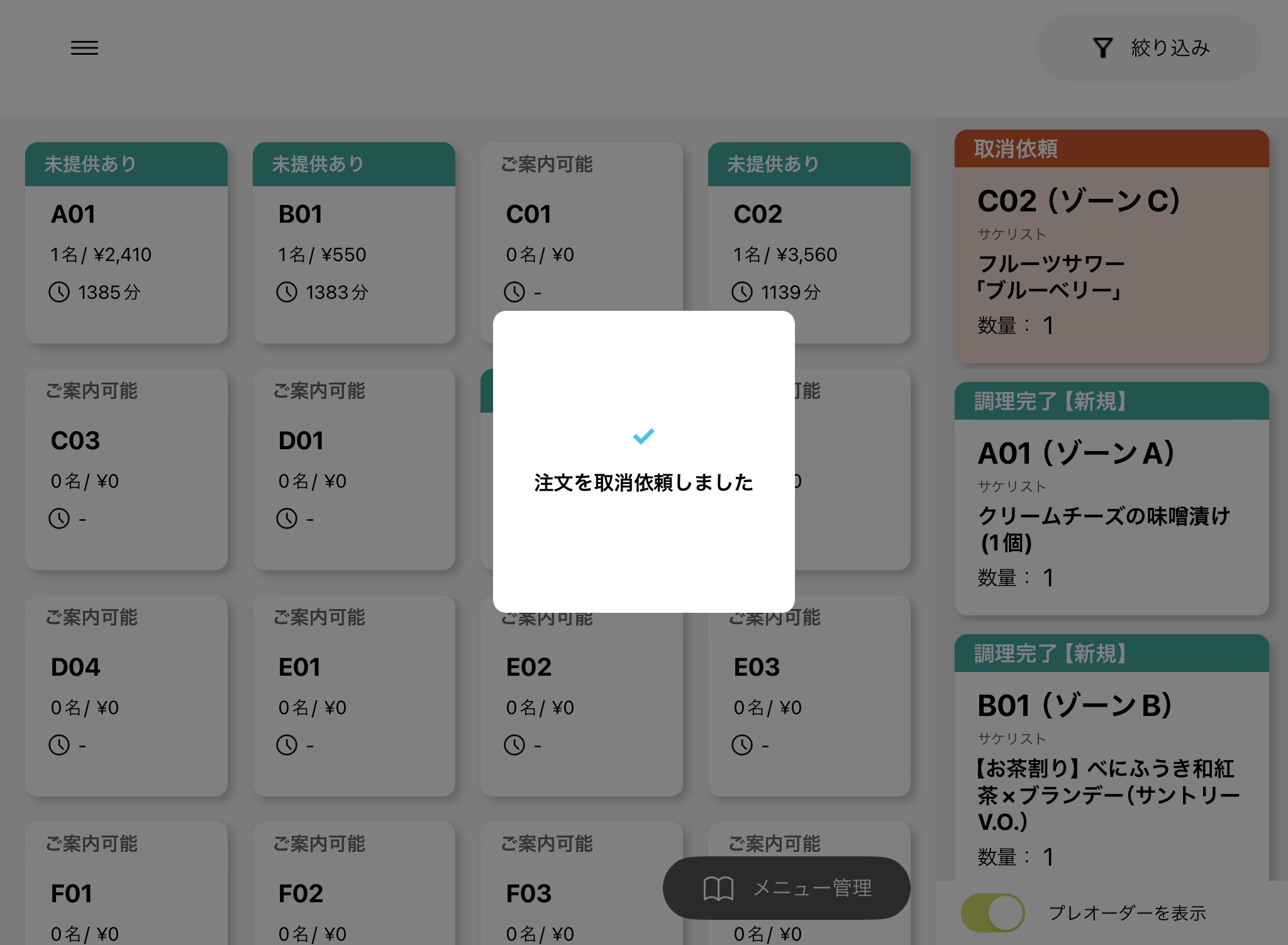 ※取消依頼をすると館(フロア)画面に表示され、フロアスタッフが状況を確認します。