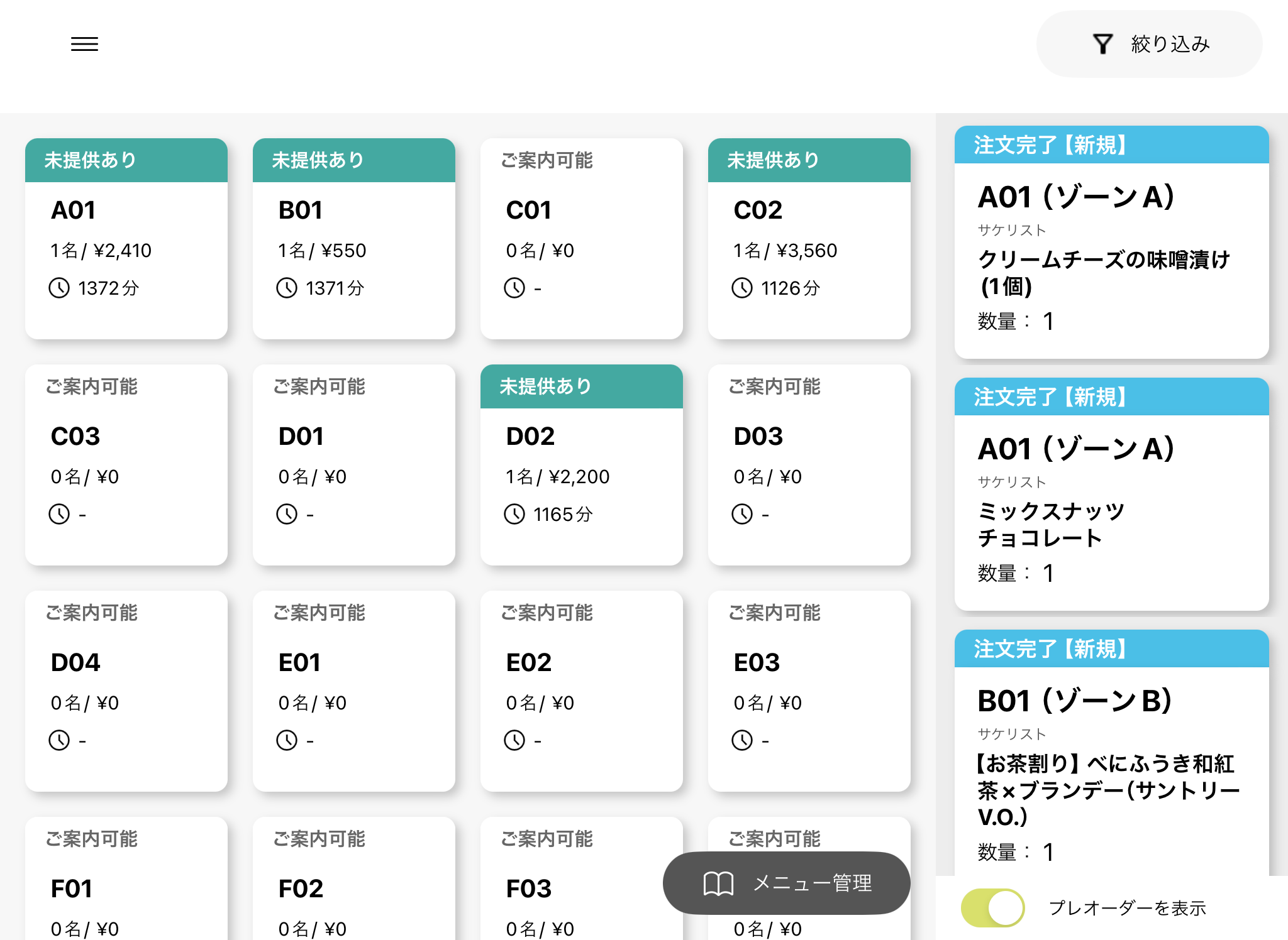 館(フロア)画面でもチケットのステータスが変更され、フロアスタッフがお客さまに提供し、ステータスを提供完了に変更します。