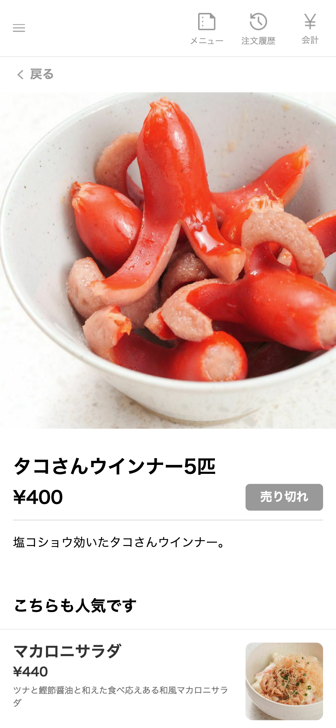 売り止めしたメニューはお客さま画面で売り切れであることが表示されます。