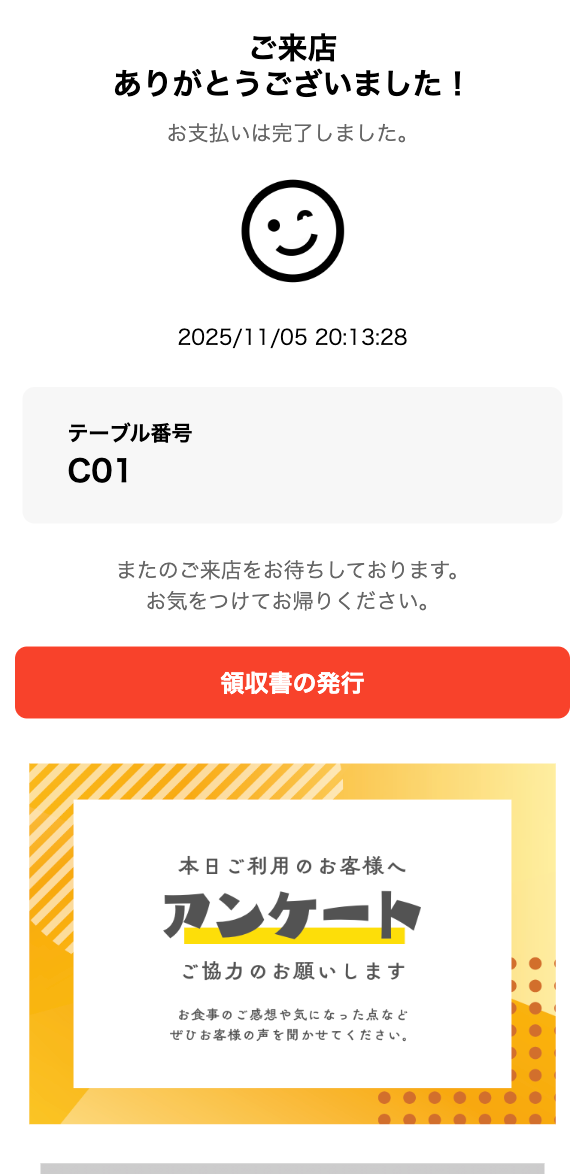 モバイルオーダー(事後決済)の決済完了画面に決済日時とテーブル名表示がされるようになりました。