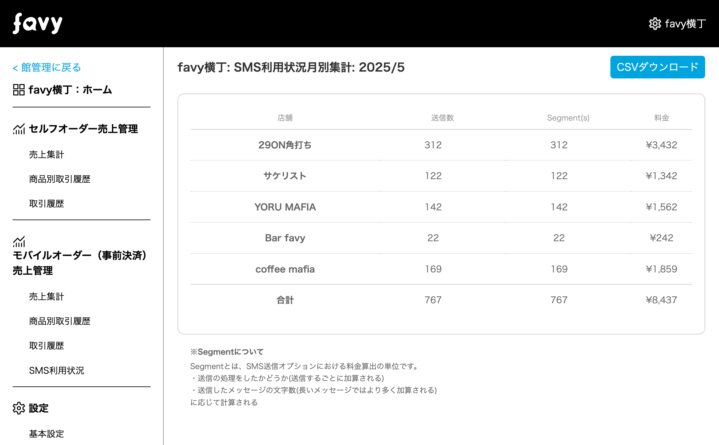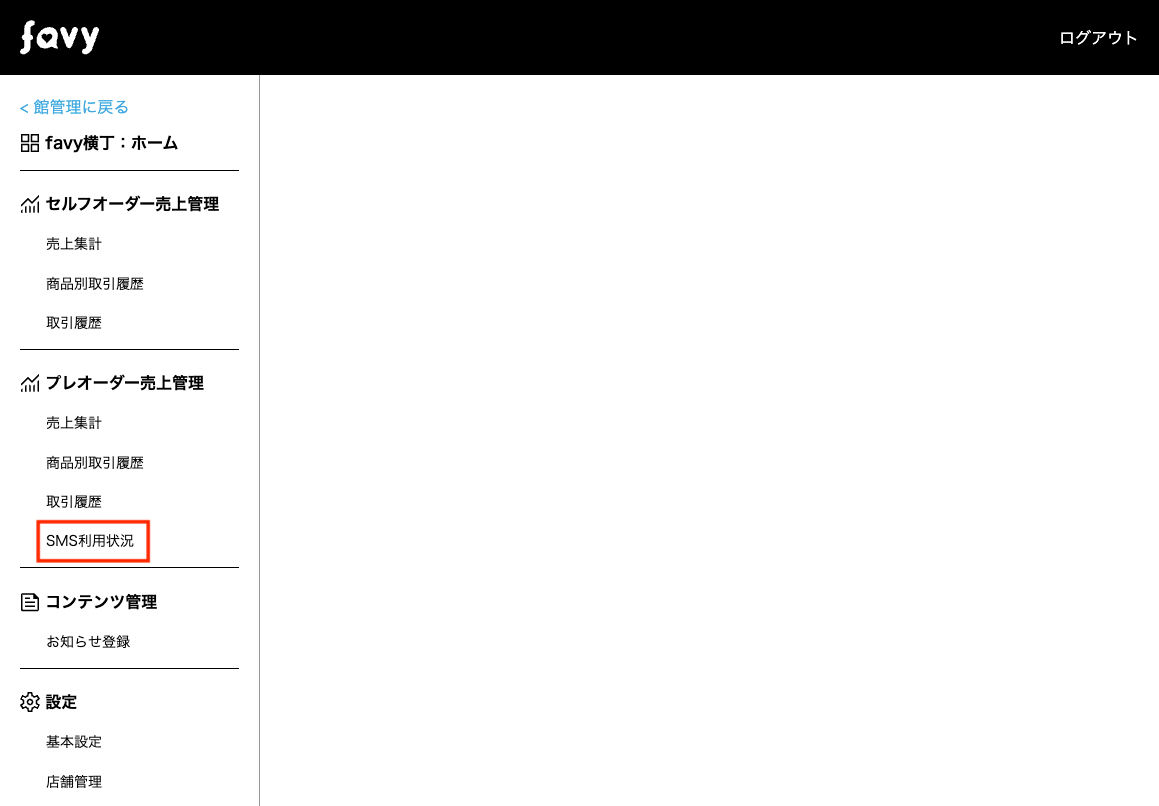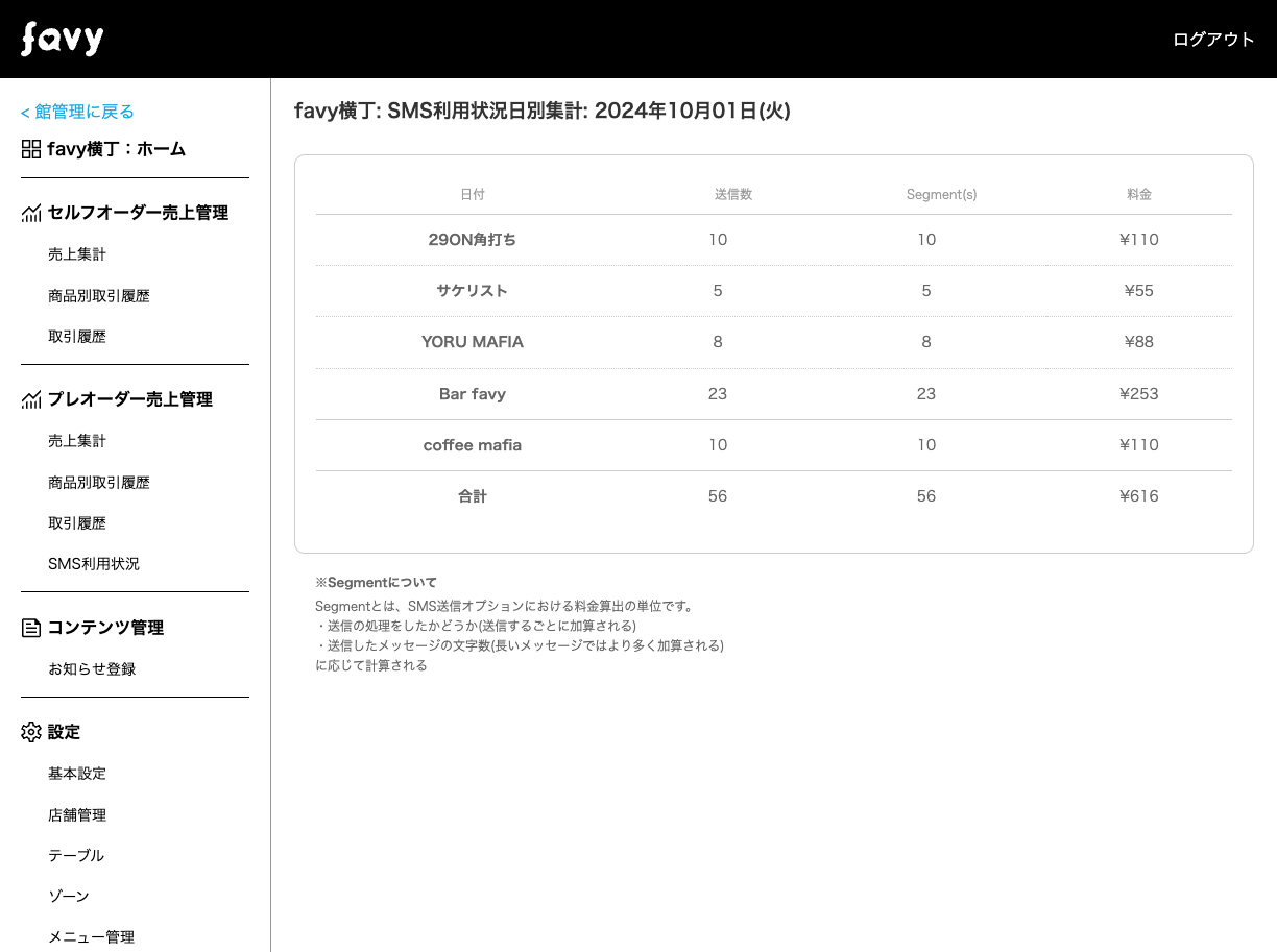 favyモバイルオーダー(事前決済・プレオーダー)のSMS利用状況を確認する画面です。