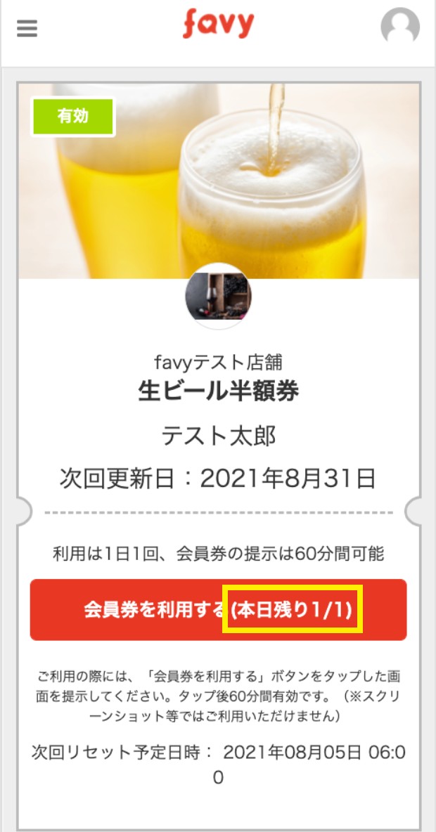 ※「1ヶ月で◯回まで利用可能」という設定では「1日1回のみ利用可能」という設定は出来ませんので、ご了承ください。1ヶ月の利用回数を定めて「1日1回のみ利用可能」とする場合は、会員特典内容に注意書きとして記載して、店舗にて案内の際に注意事項としてお伝えください。