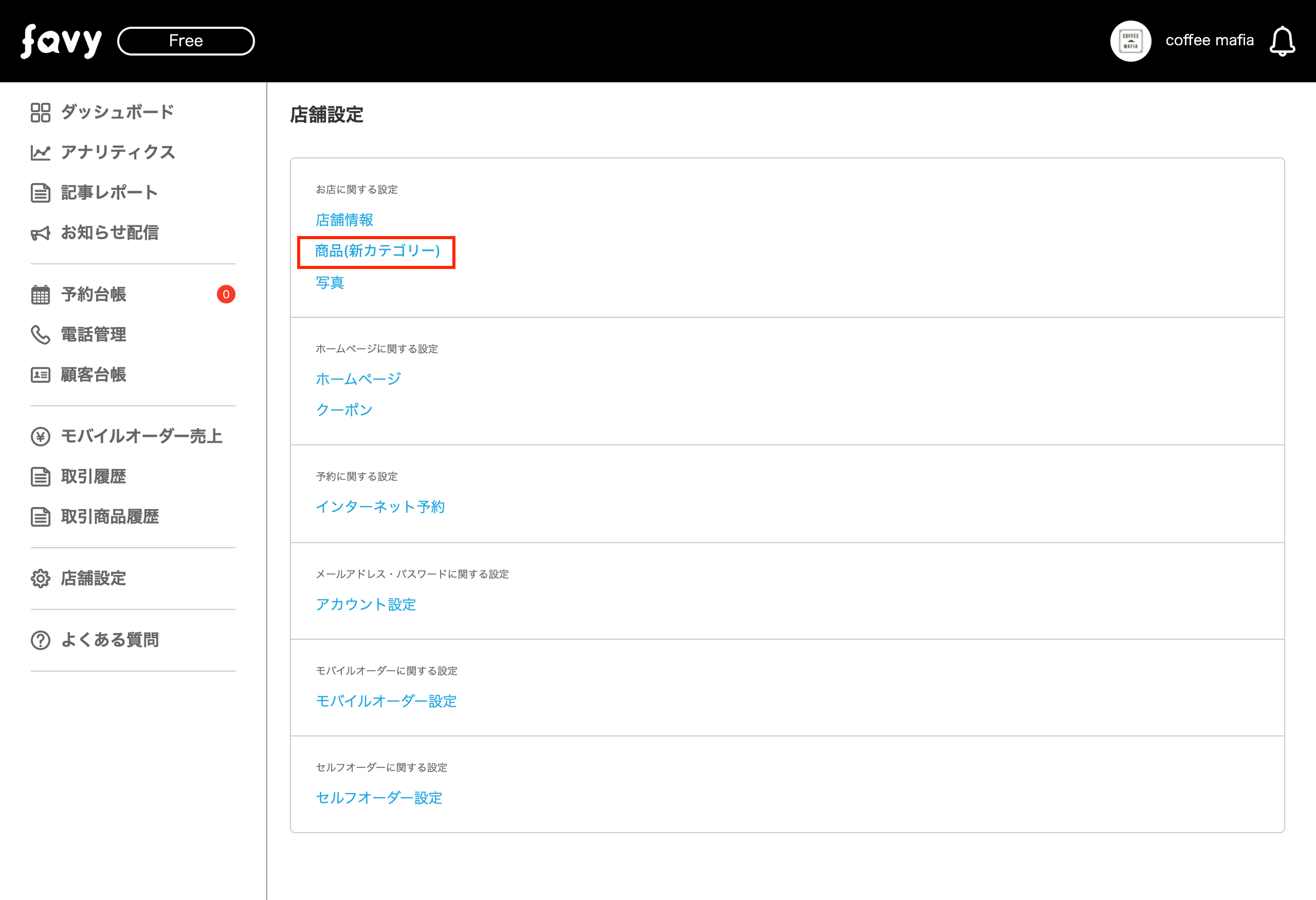 店舗設定の中の「商品(新カテゴリー)」を選択します。
