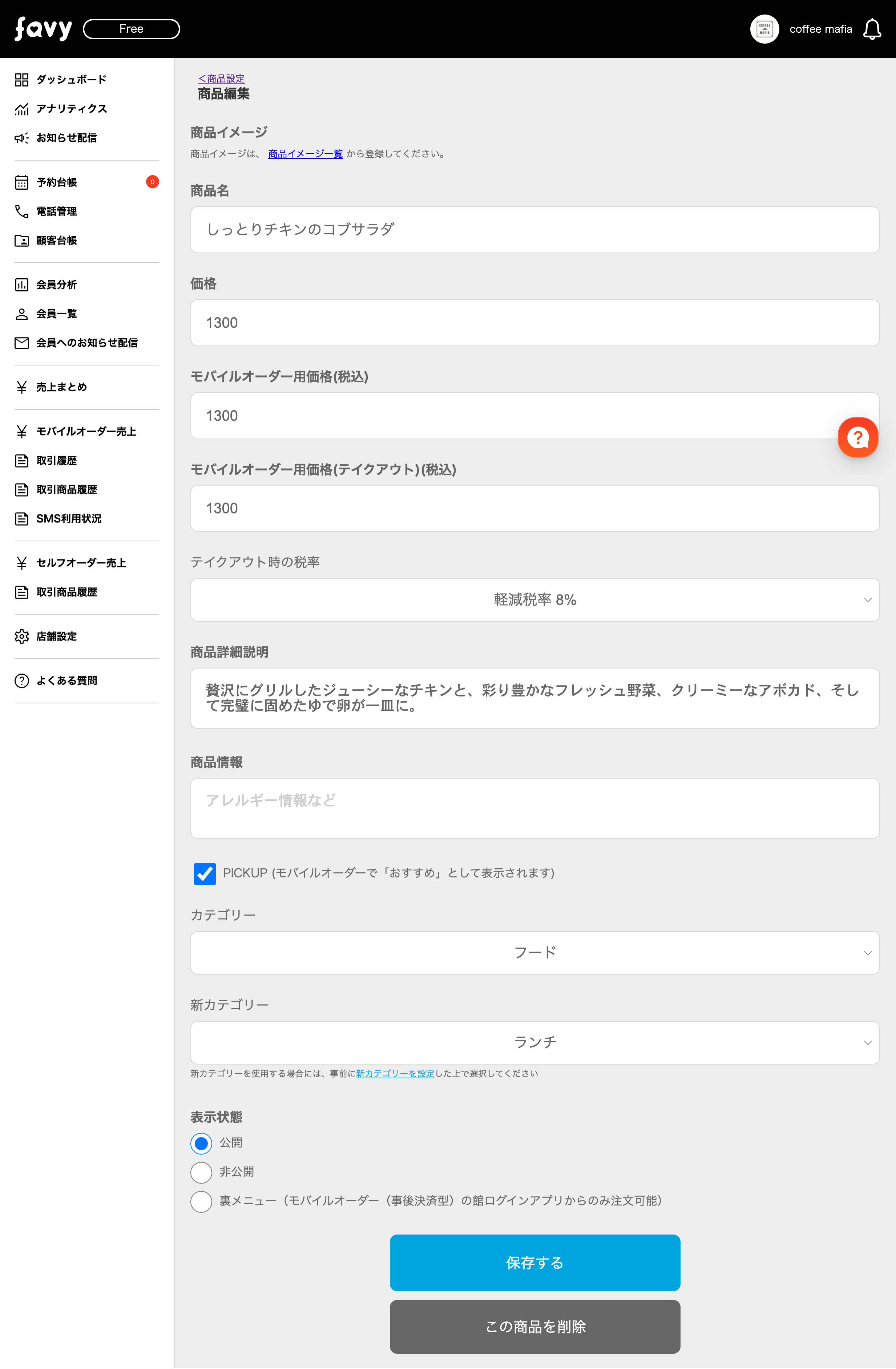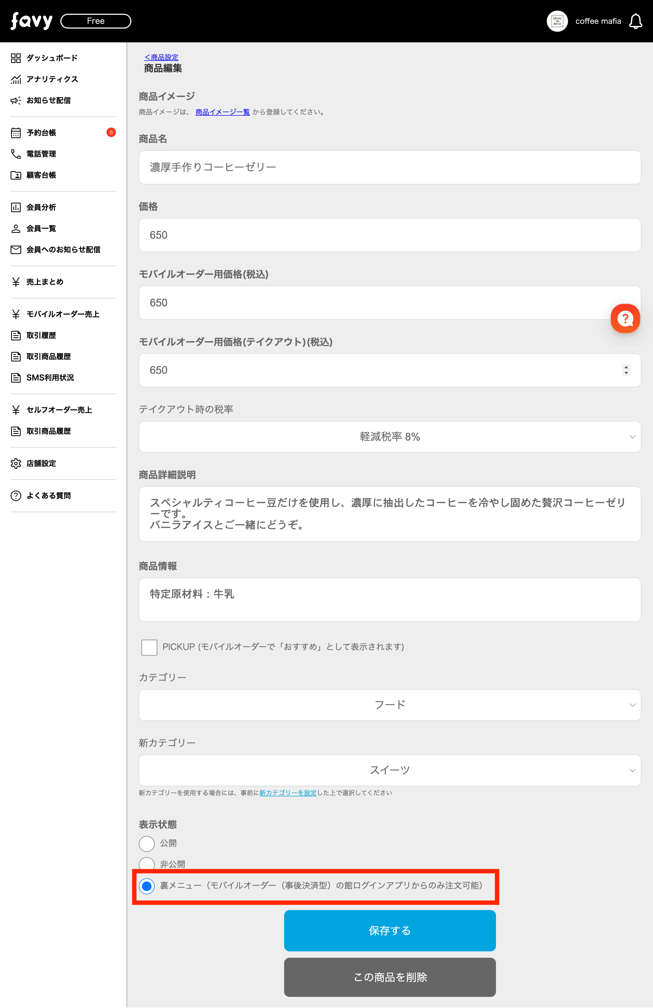 例:「濃厚手作りコーヒーゼリー」を裏メニューに設定したい場合、商品編集画面にて、「裏メニュー」にチェックを入れて保存する