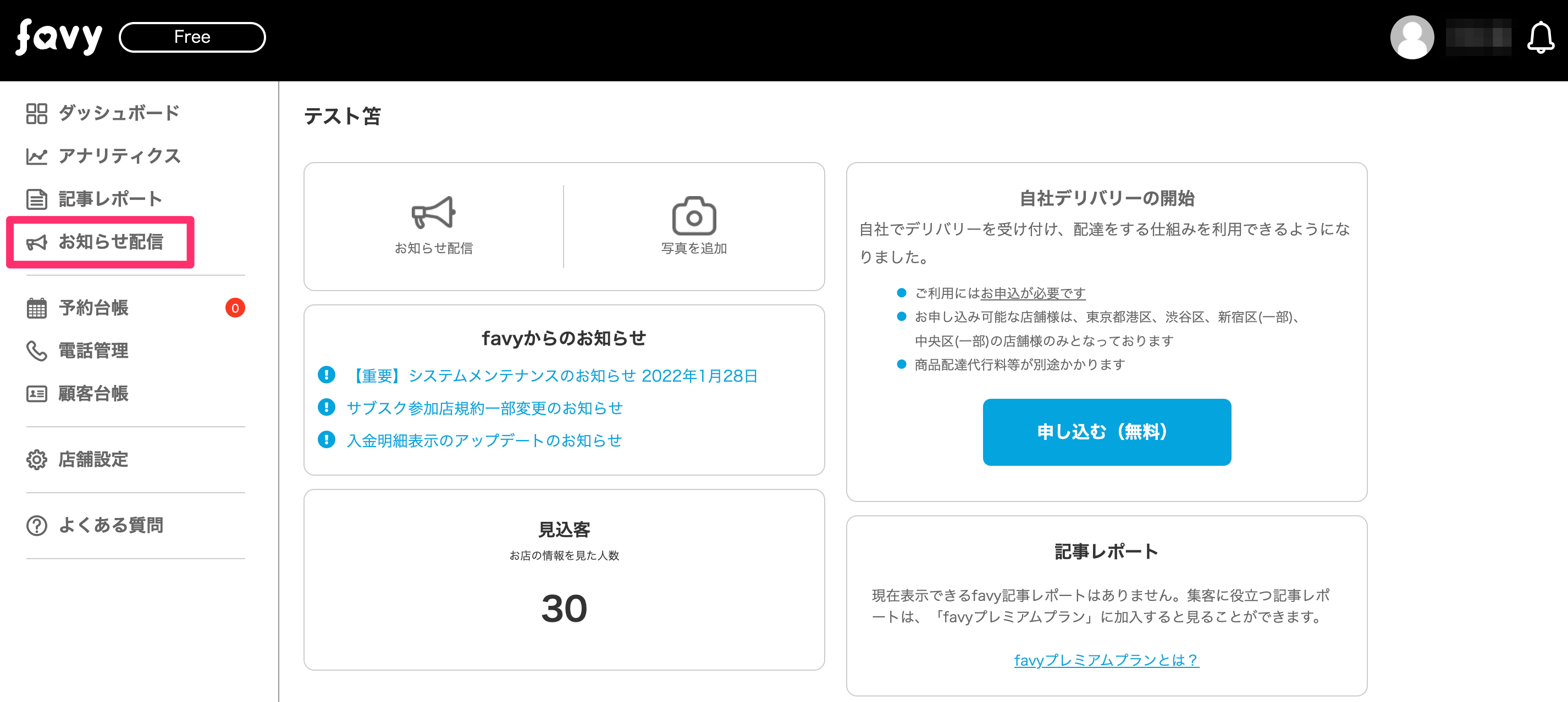 お知らせ配信とは、お店のイチオシメニューやコース紹介、ニュースなど、お店からの情報を発信できるPRエリアのことをいいます。