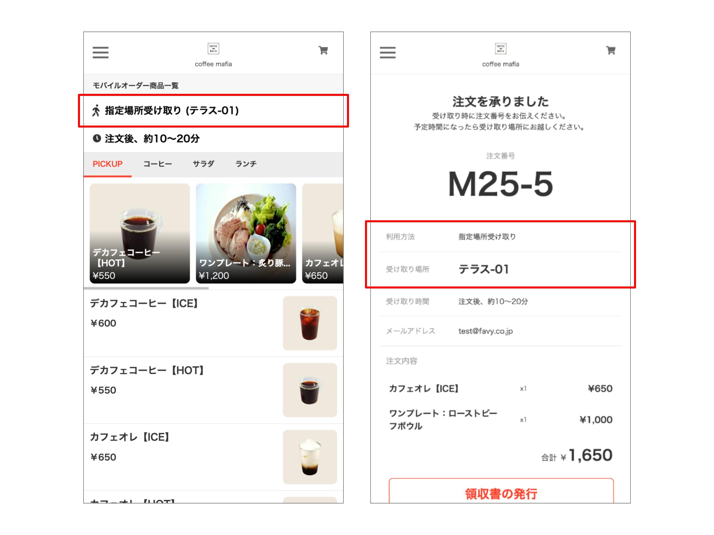 モバイルオーダー(事前決済)で、特定のURLからご注文いただくと、受け取り場所が指定された状態で注文を受け付けられるようになりました。