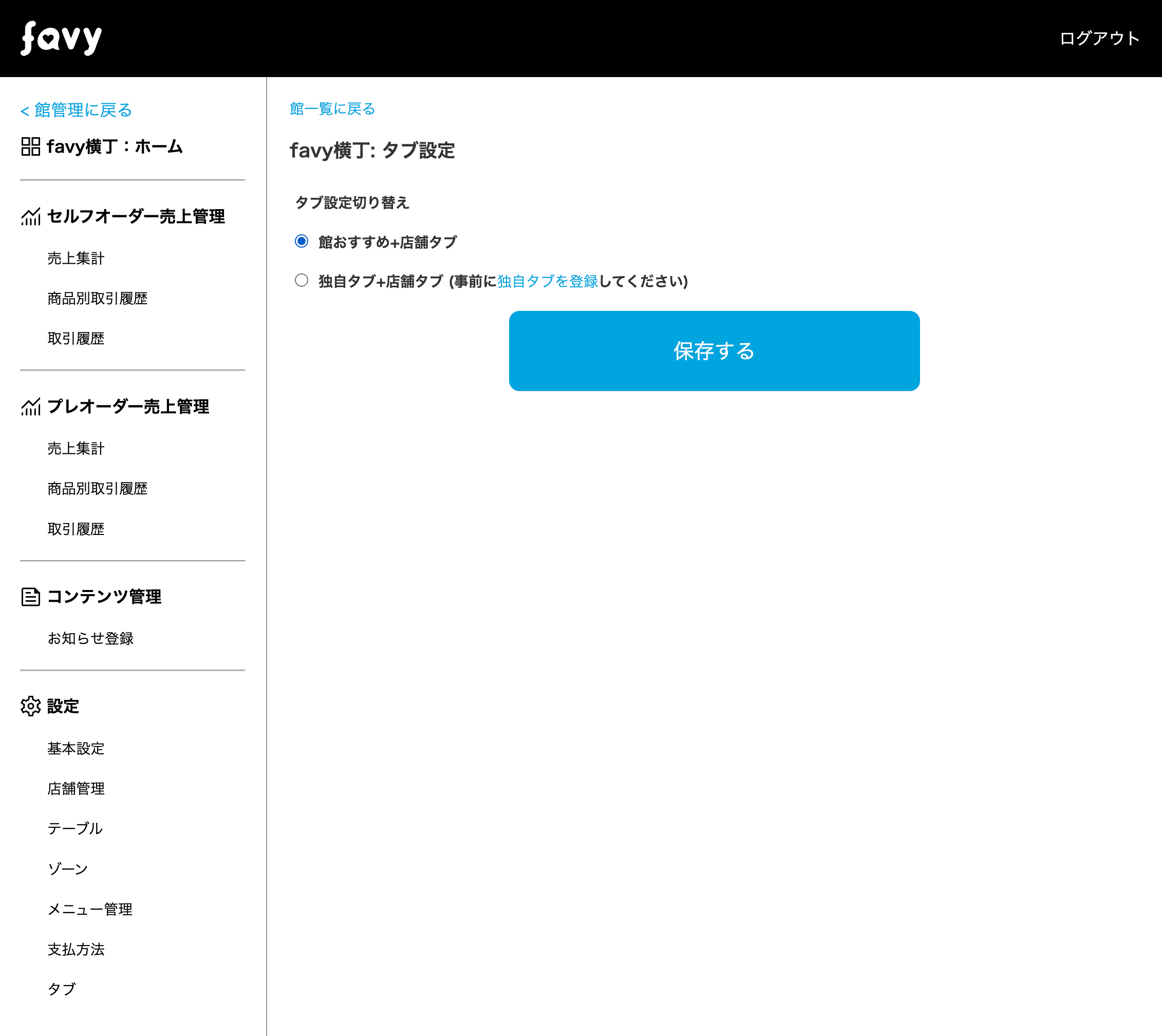 「独自タブ+店舗タブ」を選択して保存すると独自タブが表示されるようになります。