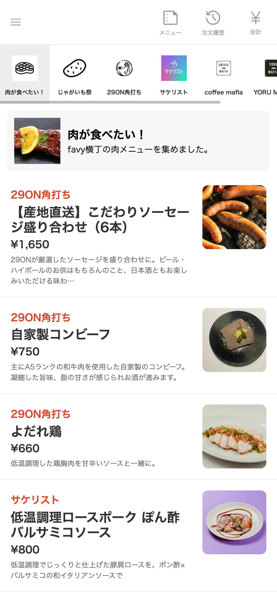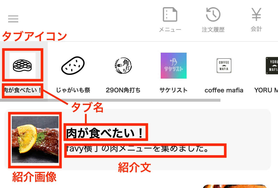 画像中「肉が食べたい!」「じゃがいも祭」が独自タブです。以降は店舗タブがランダムに表示されています。