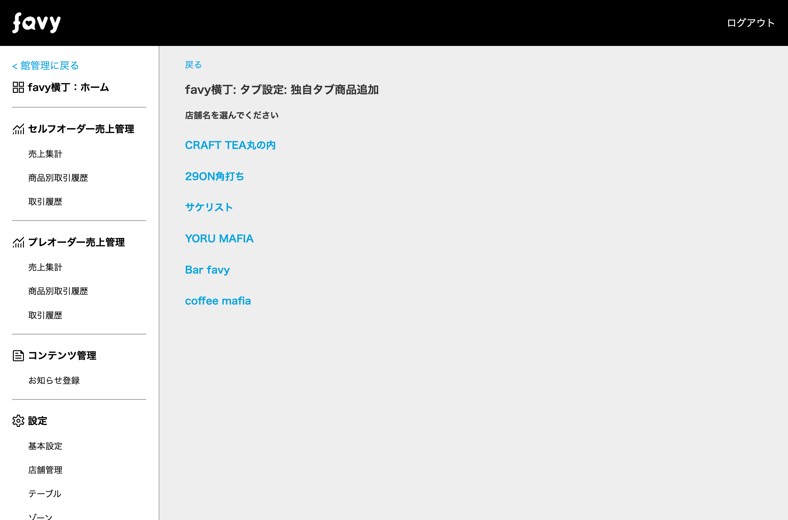 「商品設定」の「新規追加」を選択すると、館に所属している店舗一覧が表示されます。