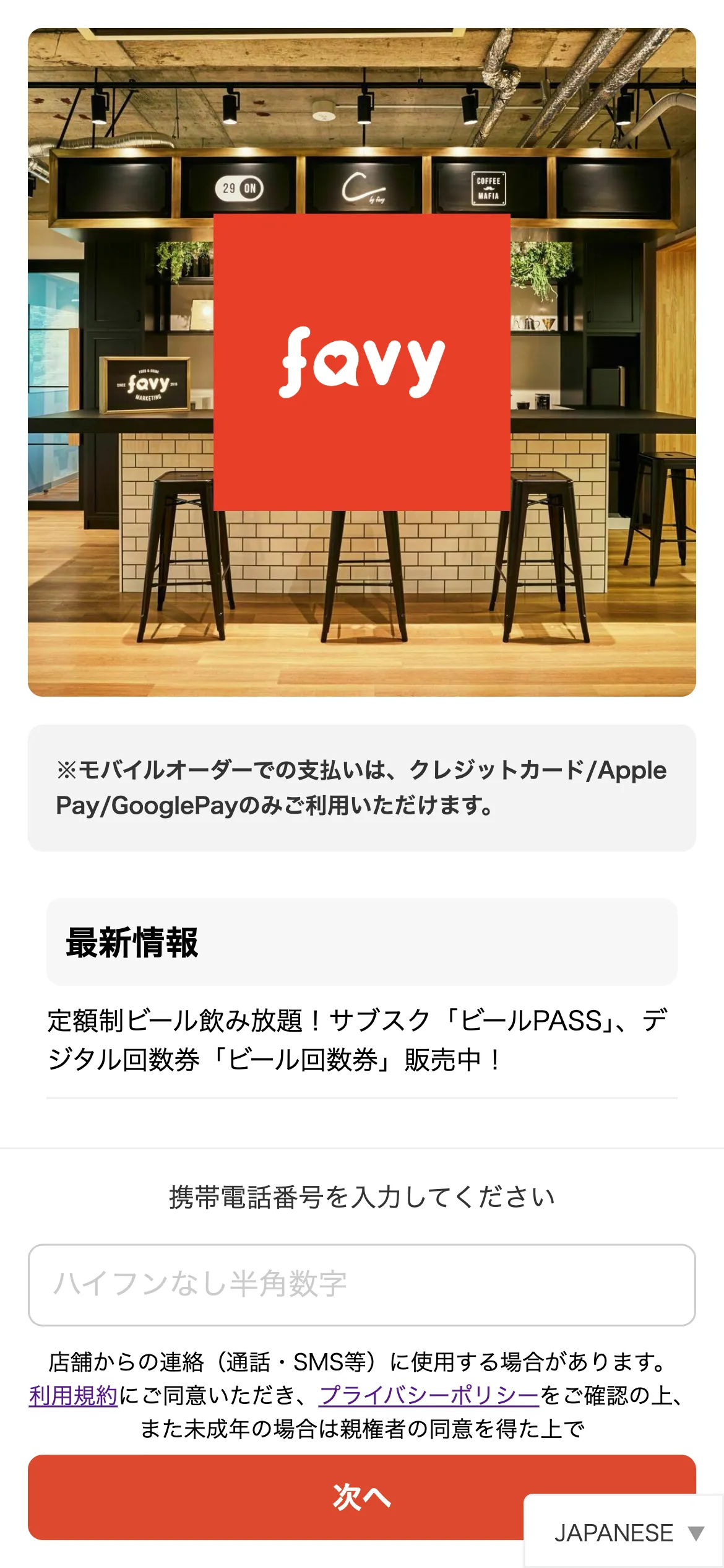 ※事前決済型の電話番号入力設定はfavy側で設定が必要となります。ご希望の場合は弊社までご連絡ください。