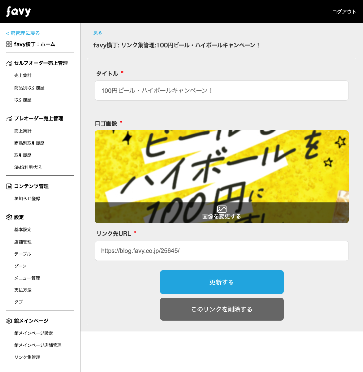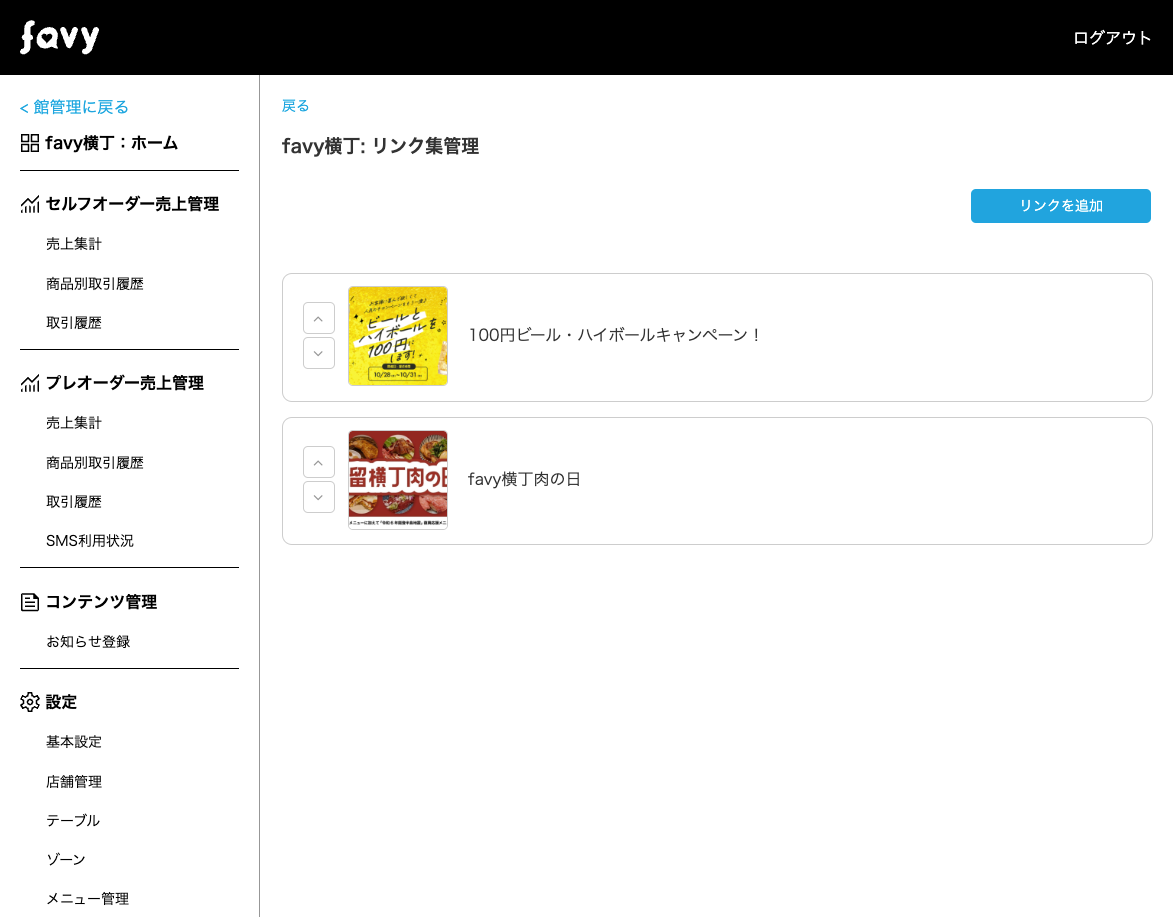 館メインページ(館に所属する店舗の情報をまとめたページ)に追加するリンク集を編集する画面です。